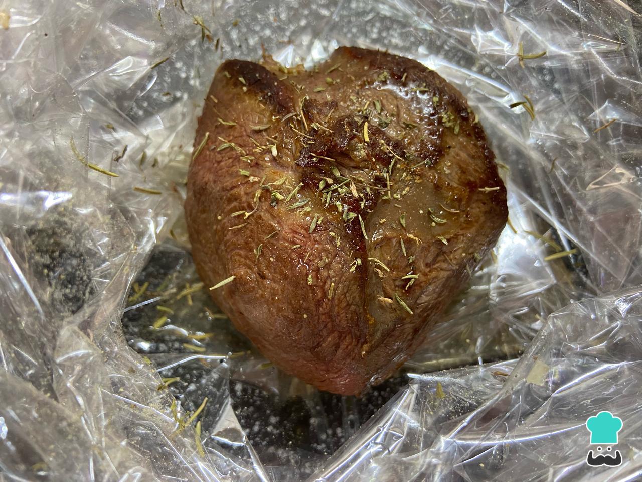 Una vez dorado, coloca la carne dentro de una bolsa para cocción en horno y condimenta con sal, pimienta, tomillo y romero a gusto.