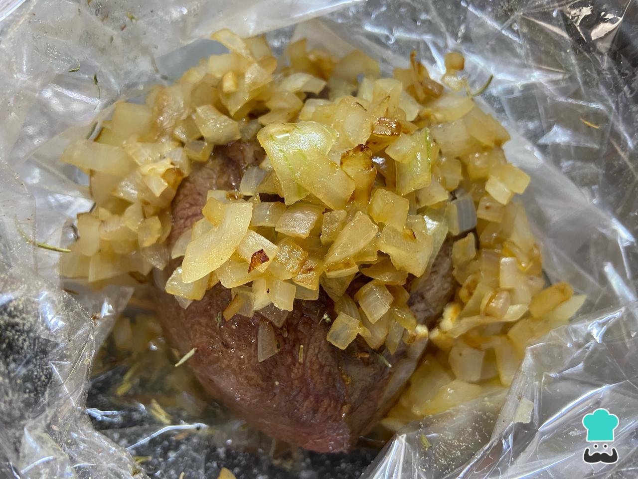 Vuelca la cebolla y junto con el caldo en la bolsa sobre el peceto. Cierra la bolsa y lleva a horno precalentado a 170 °C por 1 hora.