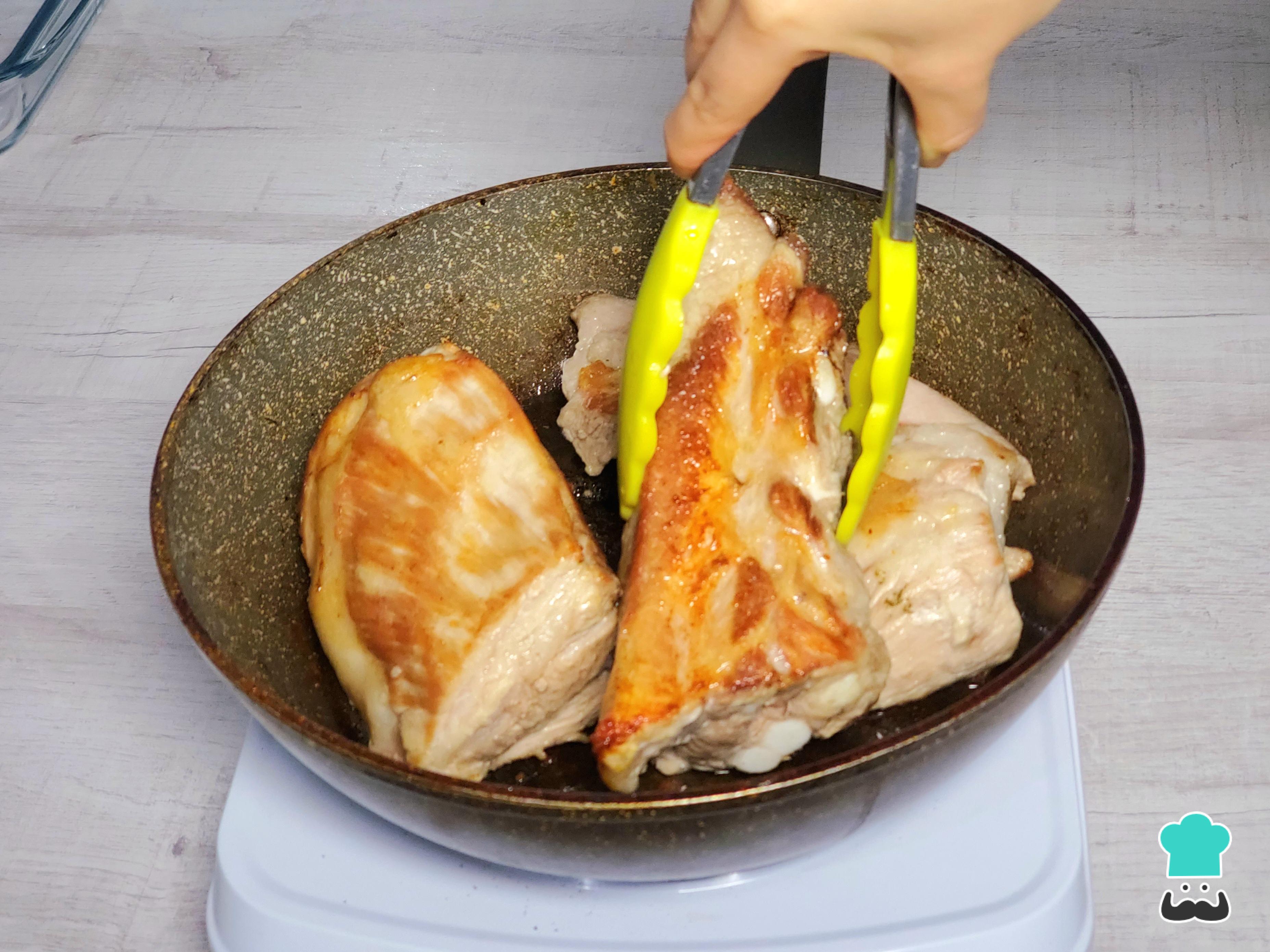Empieza cortando el pechito de cerdo en mitades o en tres piezas, según el tamaño. Salpimienta bien cada trozo para que tenga sabor desde el inicio. Luego, colócalos en una sartén caliente para sellarlos por todos sus lados hasta que estén bien dorados. Una vez listos, retíralos y pásalos a una fuente apta para horno. Cocina a 180 °C durante unos 45 minutos, o hasta que estén tiernos y jugosos.