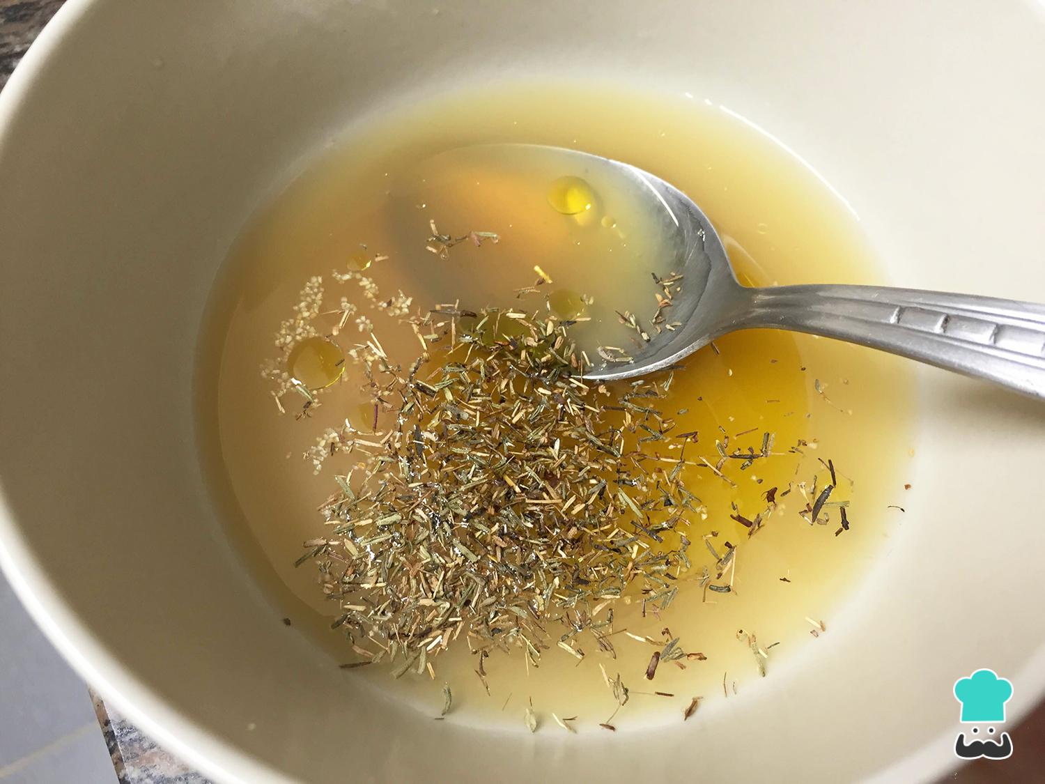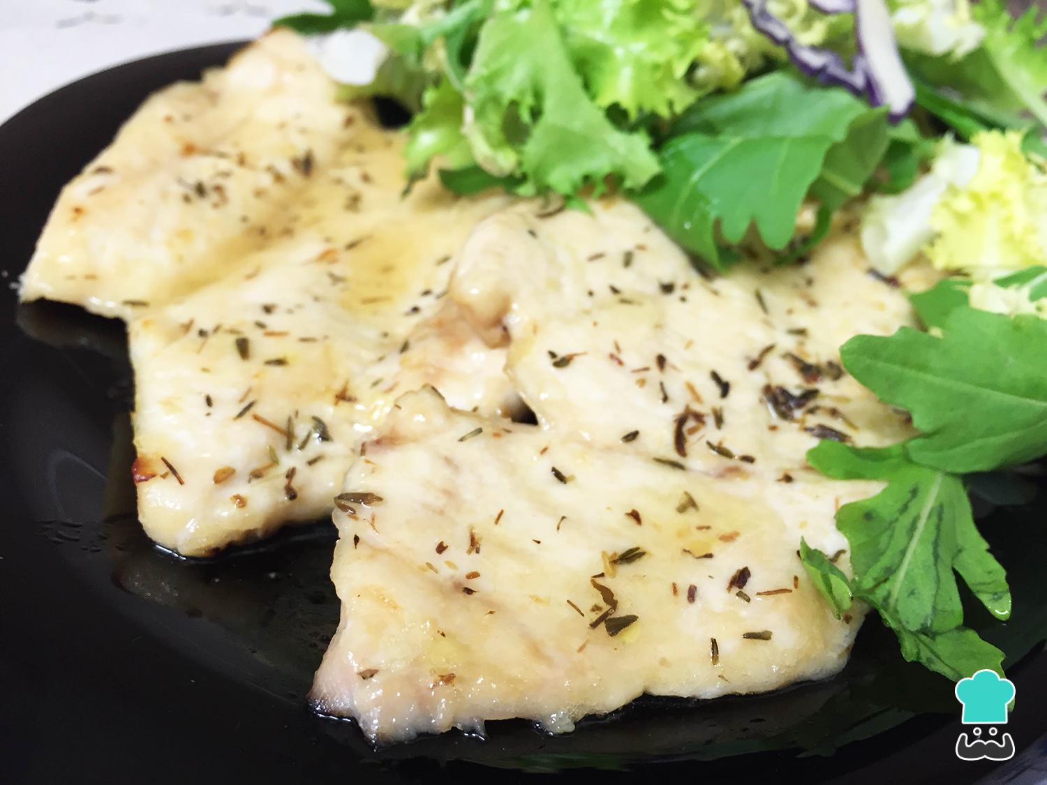 Antes de ponernos manos a la obra con la receta de pollo, exprimimos el limón, fileteamos las pechugas y las reservamos para preparar la salsa de limón y miel. Para ello, cogemos un bol y mezclamos con una cuchara o espátula el zumo de limón con la miel, un chorro generoso de aceite, sal, tomillo al gusto y los dientes de ajo bien picados. Si lo prefieres, puedes utilizar ajo en polvo o pasta de ajo. Así mismo, puedes sustituir el tomillo por romero.