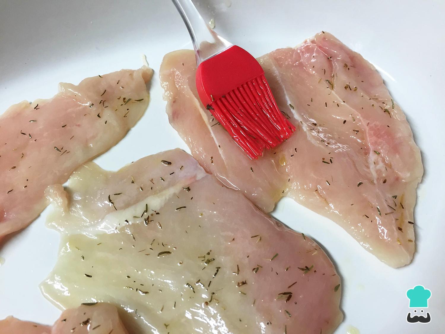 Colocamos las pechugas de pollo fileteadas en una bandeja o recipiente apto para horno y, con un pincel de cocina, untamos la salsa anterior sobre cada filete.