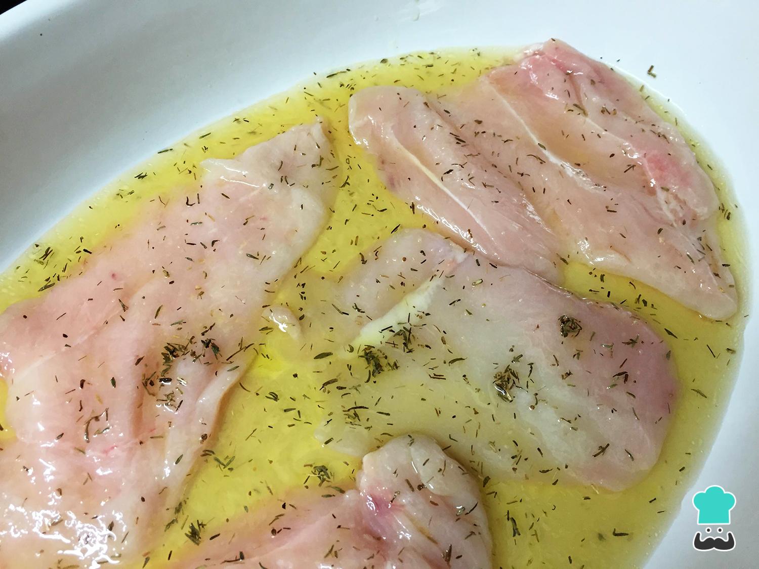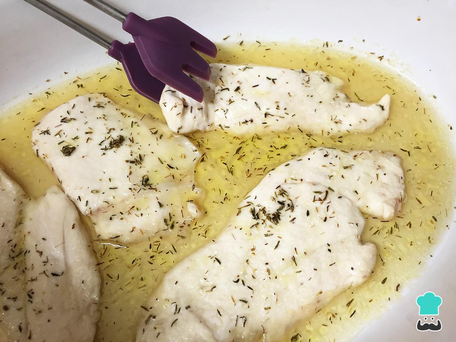 Luego, vertemos la salsa de limón y miel restante para cubrir todos los filetes. Una vez cubiertos, dejamos reposar el pollo durante 20-30 minutos para que se impregne bien del aroma y sabor de los ingredientes. Si dispones de más tiempo, puedes dejarlo hasta una hora.