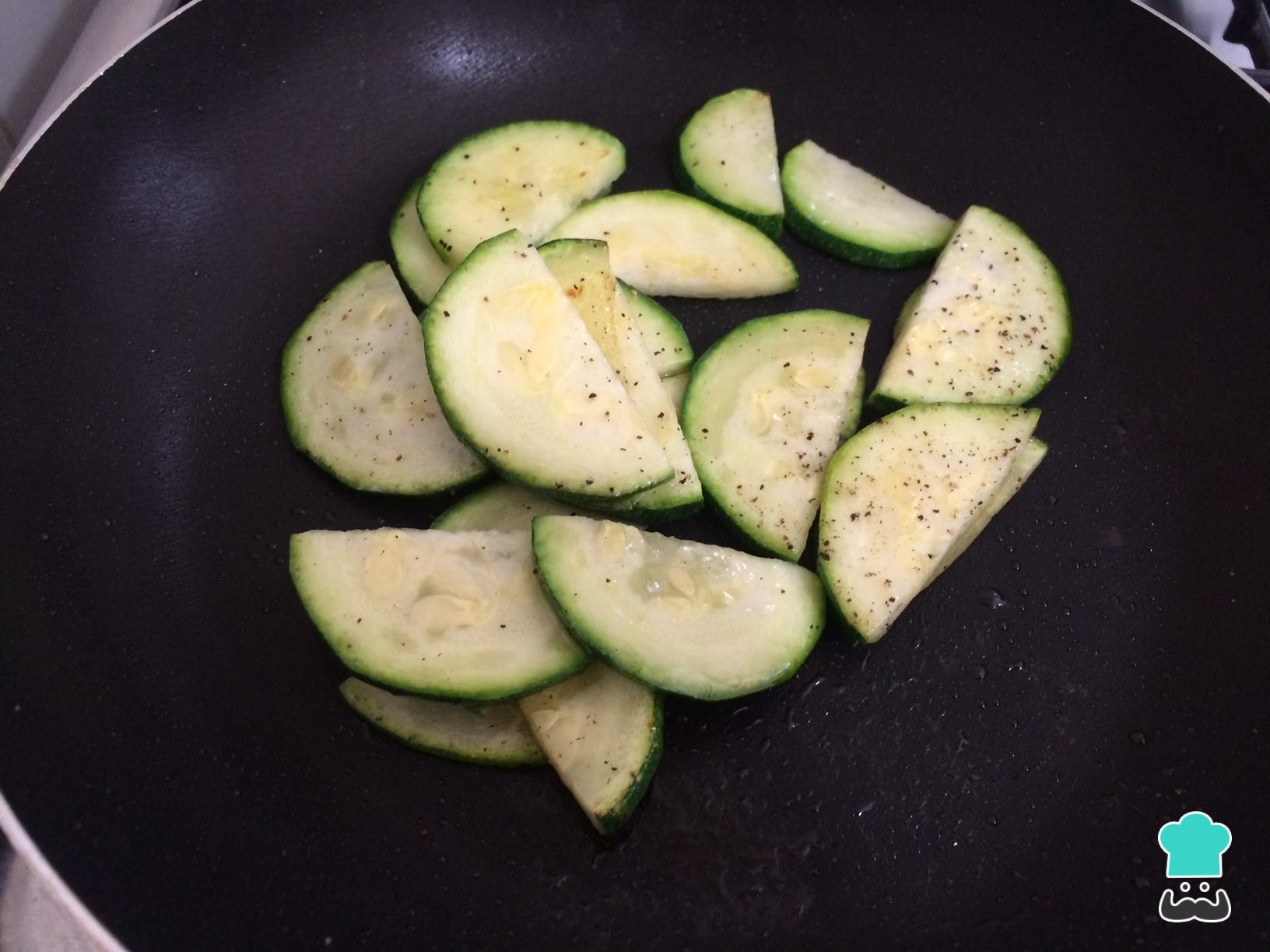 En una sartén con aceite, sofreír el calabacín cortado en media lunas hasta que este dorado, aproximadamente 5 minutos, salpimentar.