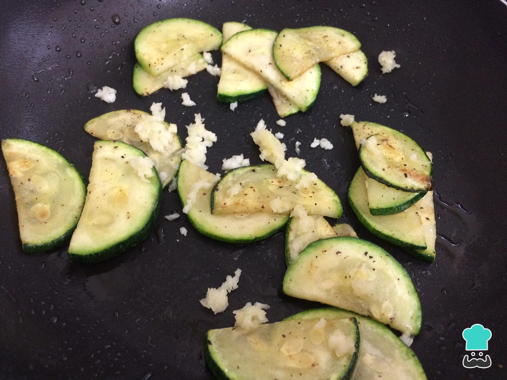 Es momento de añadir el ajo cortado finamente, saltear durante 5 minutos más hasta que el calabacín este dorado y un poco translucido.