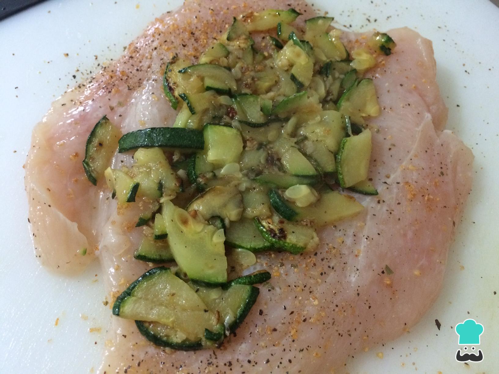 A continuación, abrir la pechuga, aderezar con sal, pimienta y el sazonador de pollo. Agregar el calabacín cortado finamente en el centro de la pechuga, cerrar y asegurar con palillos de madera muy bien para que el relleno no se salga durante la cocción.