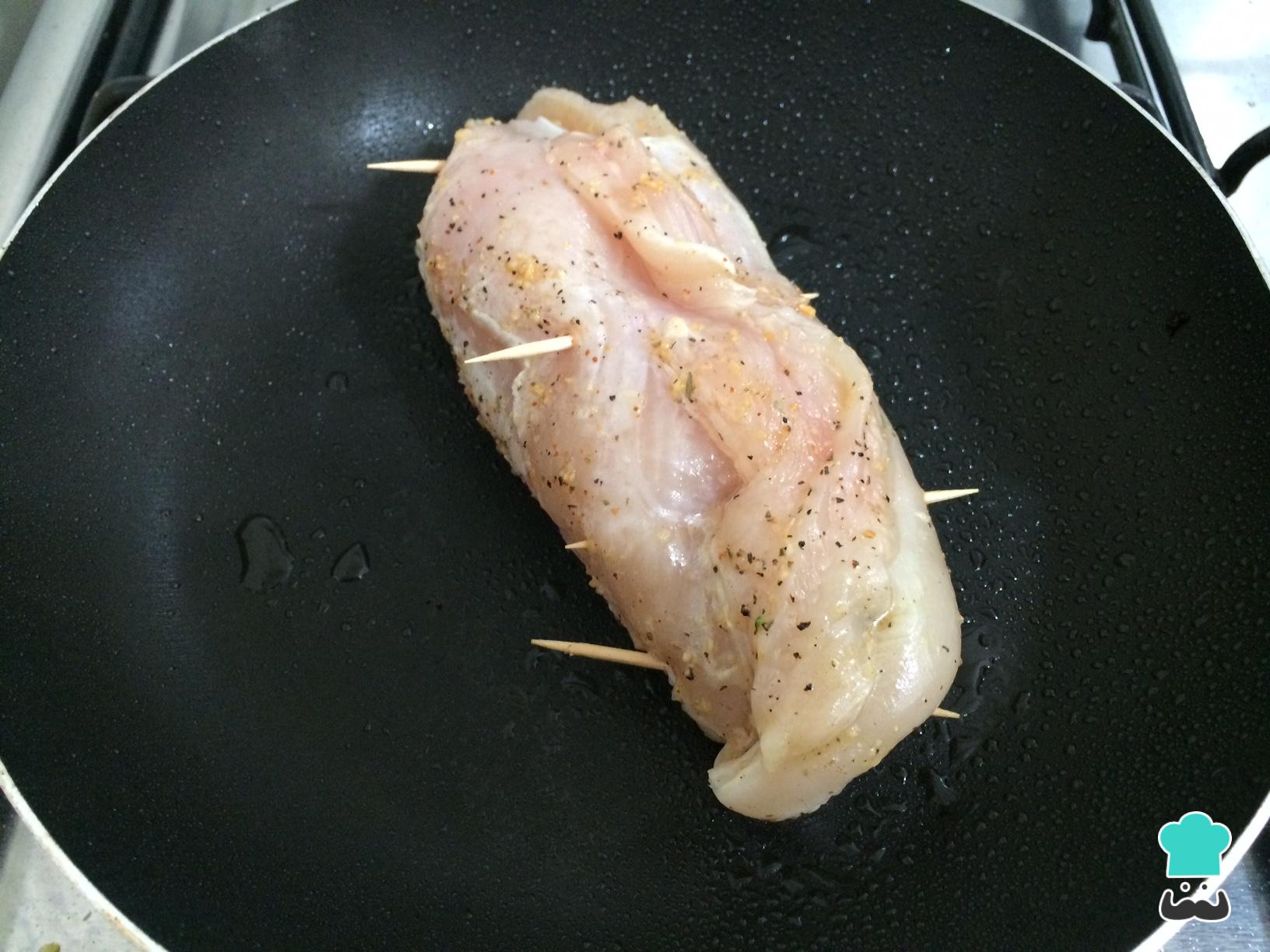 En una sartén con aceite, sellar la pechuga rellena de calabacín a fuego fuerte hasta que este dorada por todo los lados. Después bajar el fuego, tapar y cocinar durante 20 minutos.