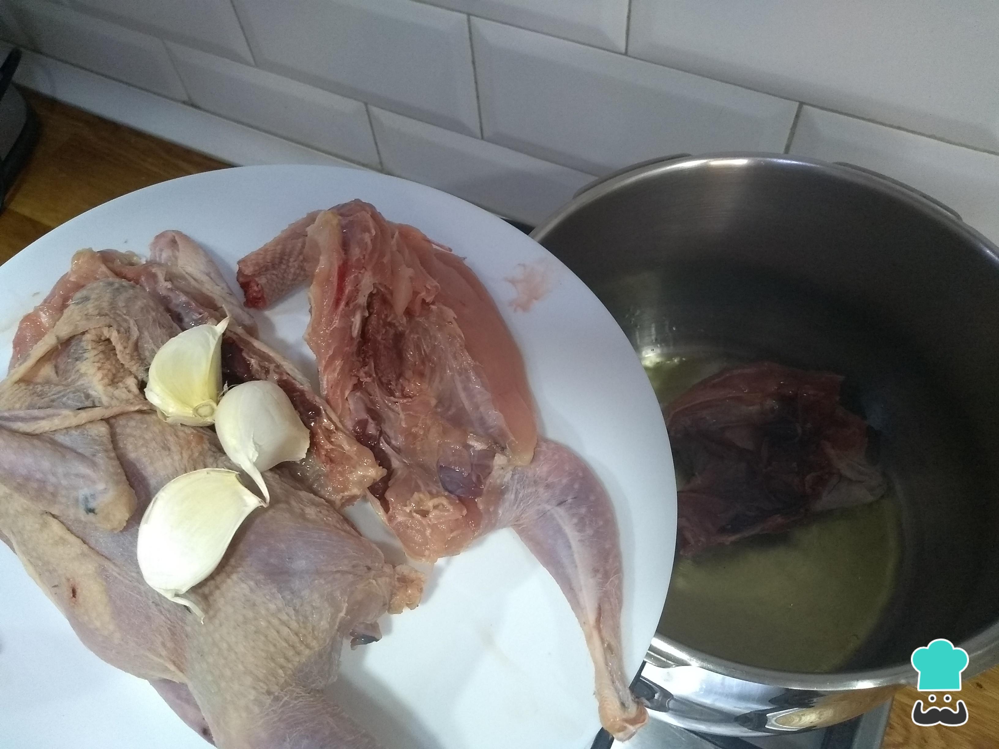 Vierte un buen chorro de aceite en una olla a presión, parte las perdices por la mitad y séllalas cuando el aceite esté bien caliente junto con los dientes de ajo en camisa (con su piel). Cuando doren las perdices, sácalas y reserva.