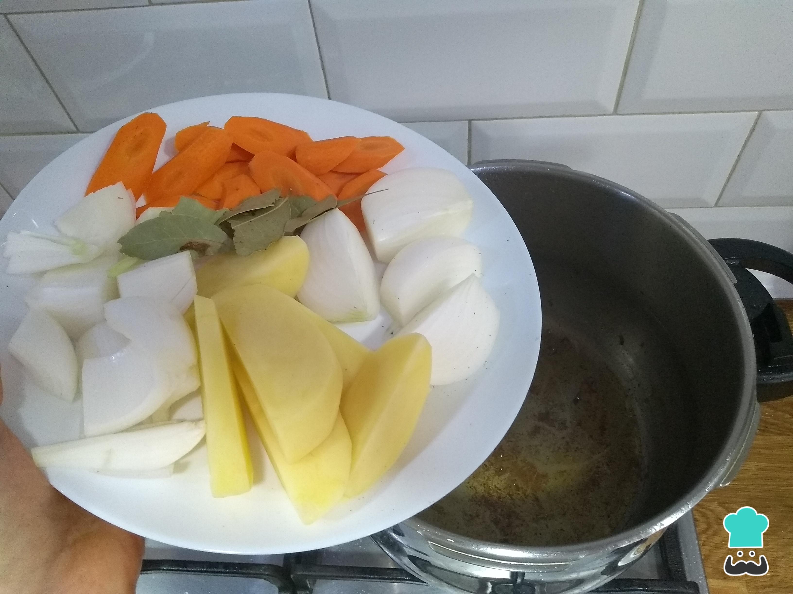 Pela y corta la patata en gajos anchos, al igual que la cebolla y la cebolleta fresca. Corta la zanahoria en trozos grandes transversales. Añade las verduras y las hojas de laurel a la olla donde doraste las perdices y sofríelas por cuatro minutos. Remueve de vez en cuando.