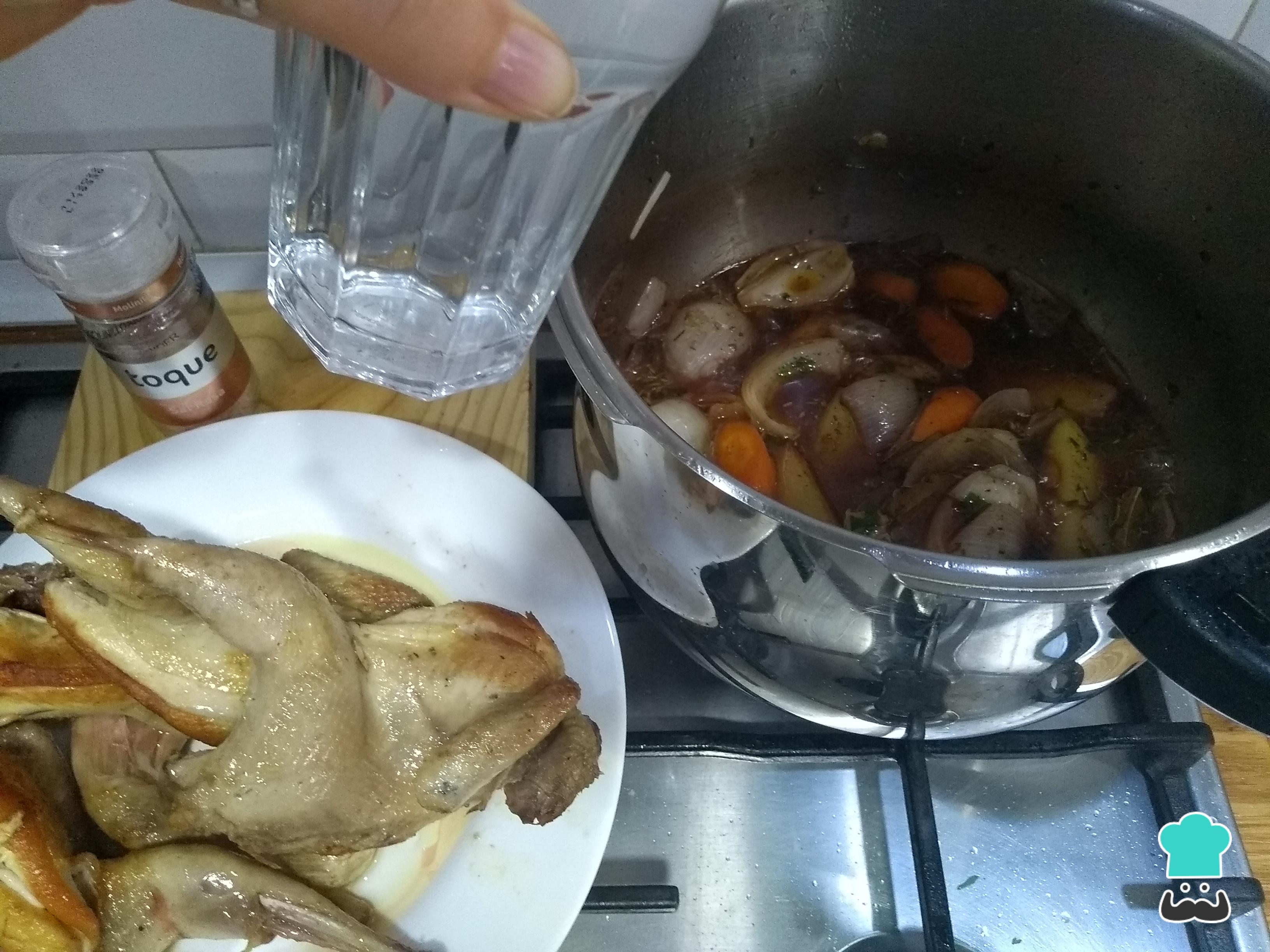 Vierte el agua para que vaya formándose un caldo. Deja que rompa a hervir y agrega las perdices. Prueba de sal, cierra la olla y deja que se cocine por media hora a fuego medio.