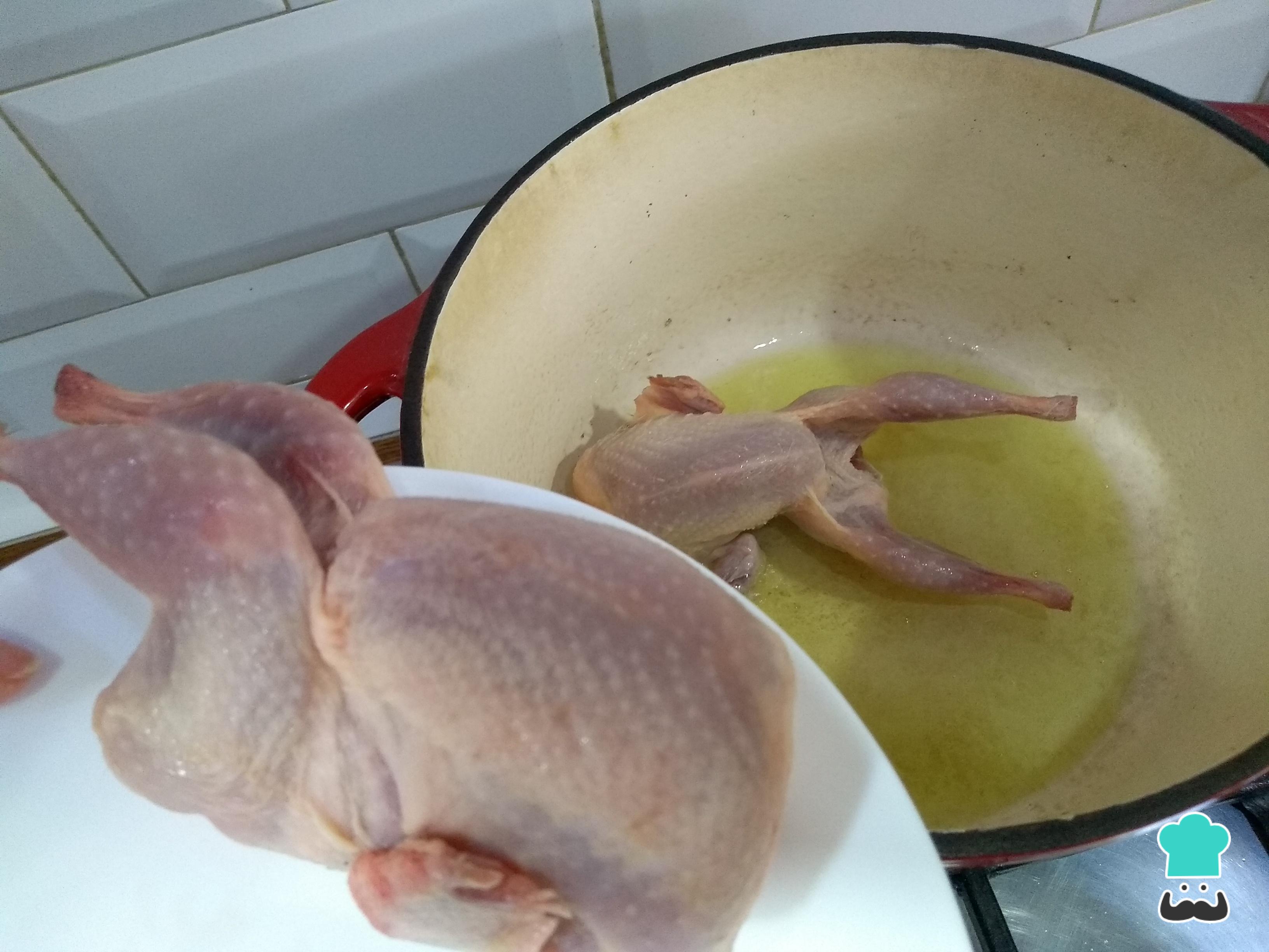 Para hacer esta receta de perdices estofadas lo primero que debes hacer es limpiar las perdices, retirando tanto las plumas como las vísceras. Puedes pedir en la carnicería que hagan esto por ti. Luego, vierte en la cazuela un buen chorro de aceite y sella las perdices para que queden doradas por fuera. Cuando estén en ese punto, sácalas y resérvalas.