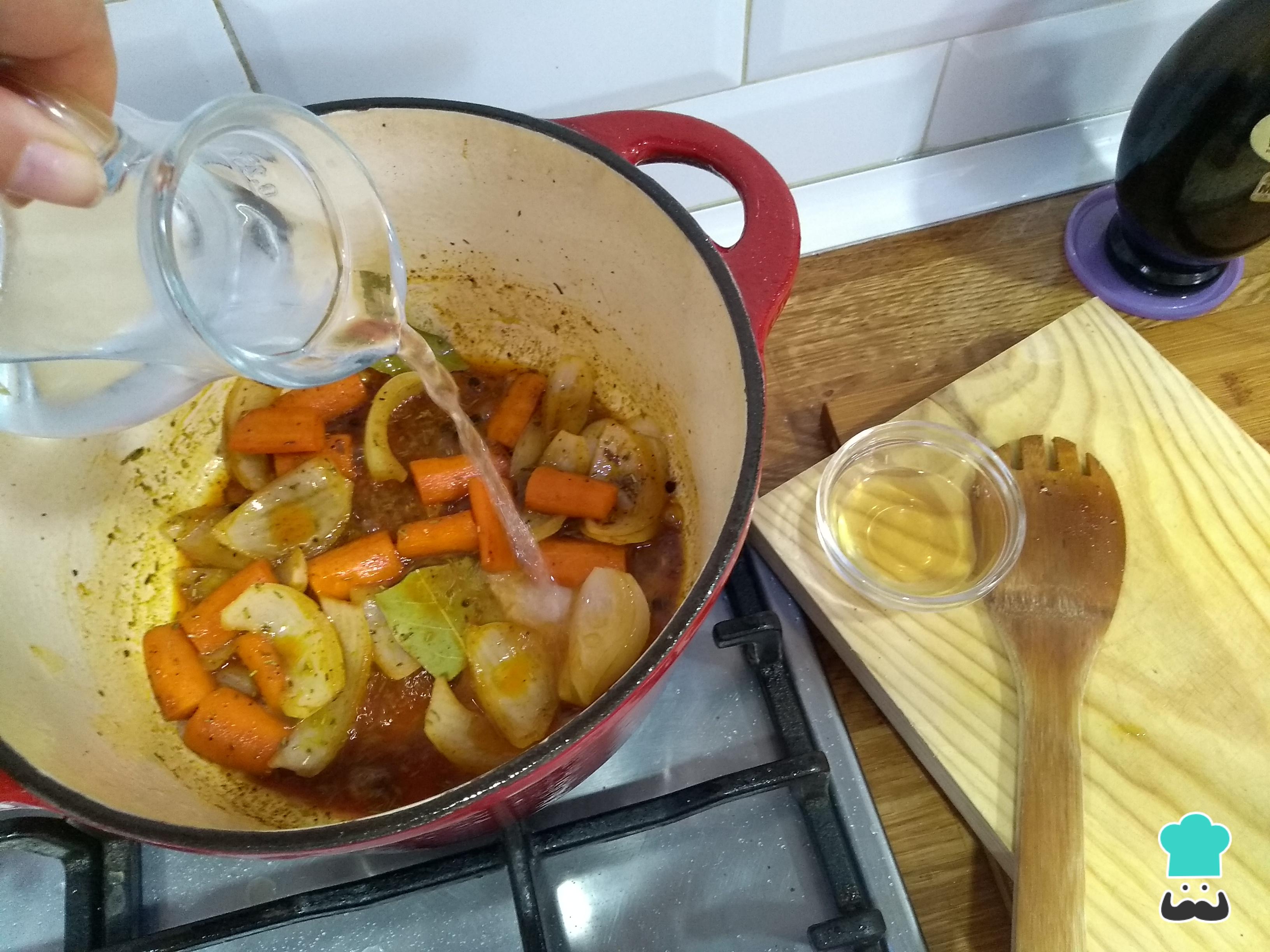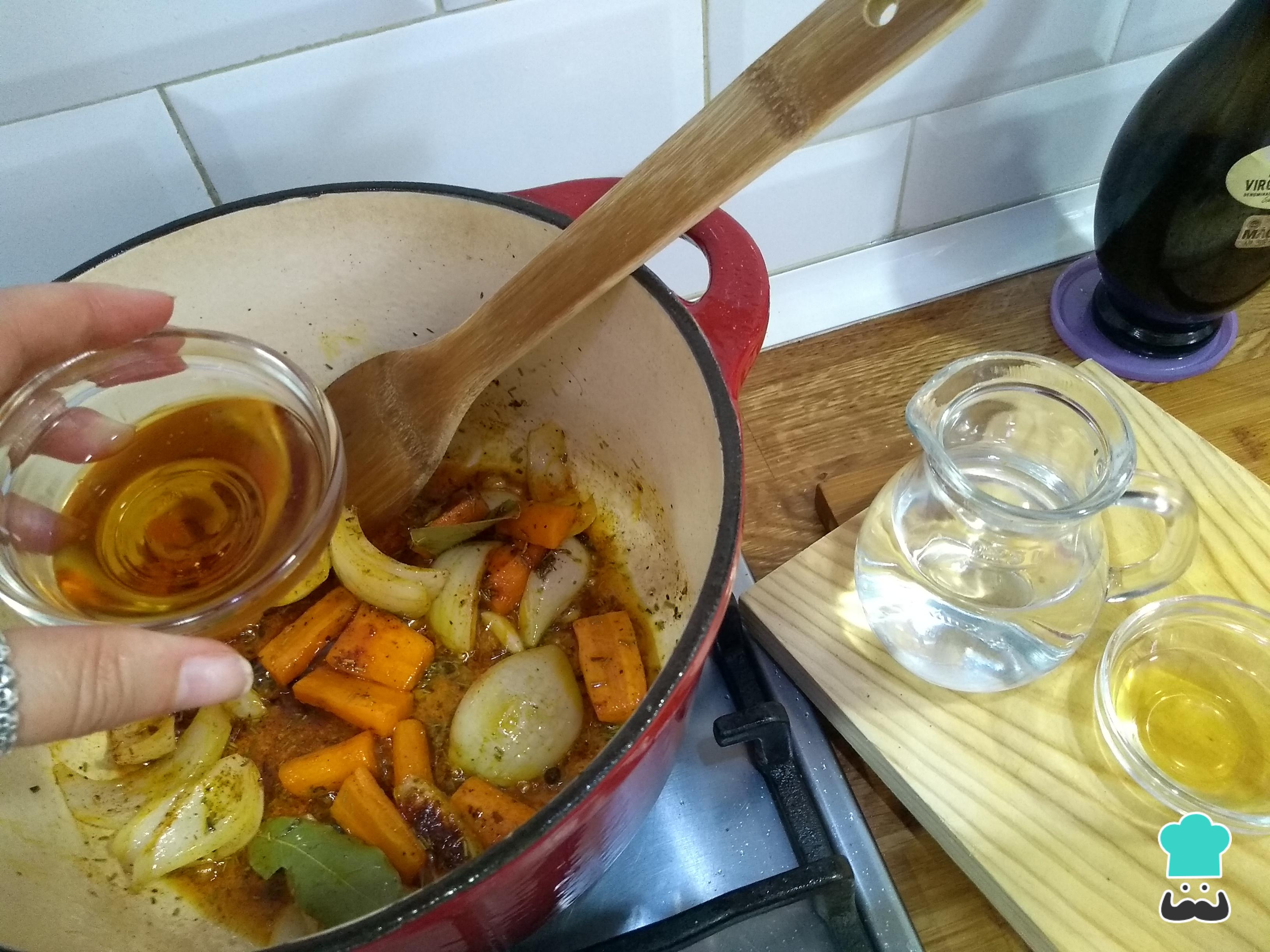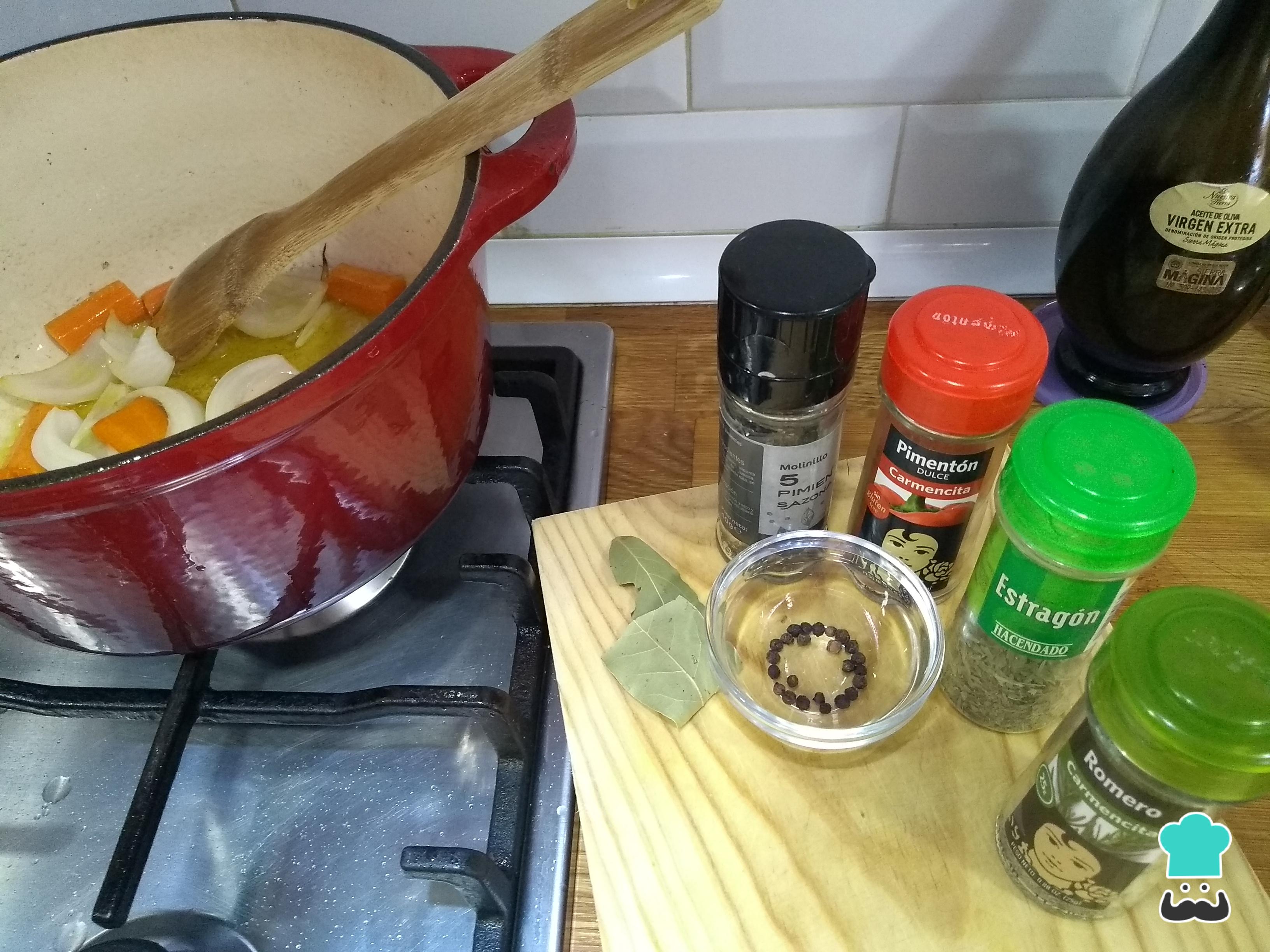 Pela y corta la zanahoria en trozos cuadrados gruesos y la cebolla en trozos grandes. A continuación, rehoga estos ingredientes durante 3 minutos y después añade el laurel y las especias, es decir, ambas pimientas, el estragón, el romero y el pimentón, remueve y tenlo unos segundos al fuego.