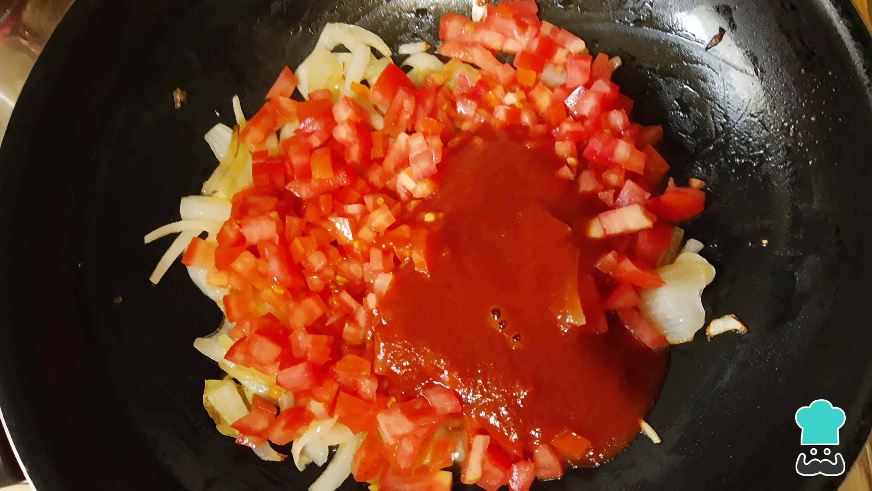 Agrega el jitomate picado y el puré de tomate, mezcla y deja cocinar por 3 minutos. Después, añade un poco más de sal y pimienta negra al gusto.
