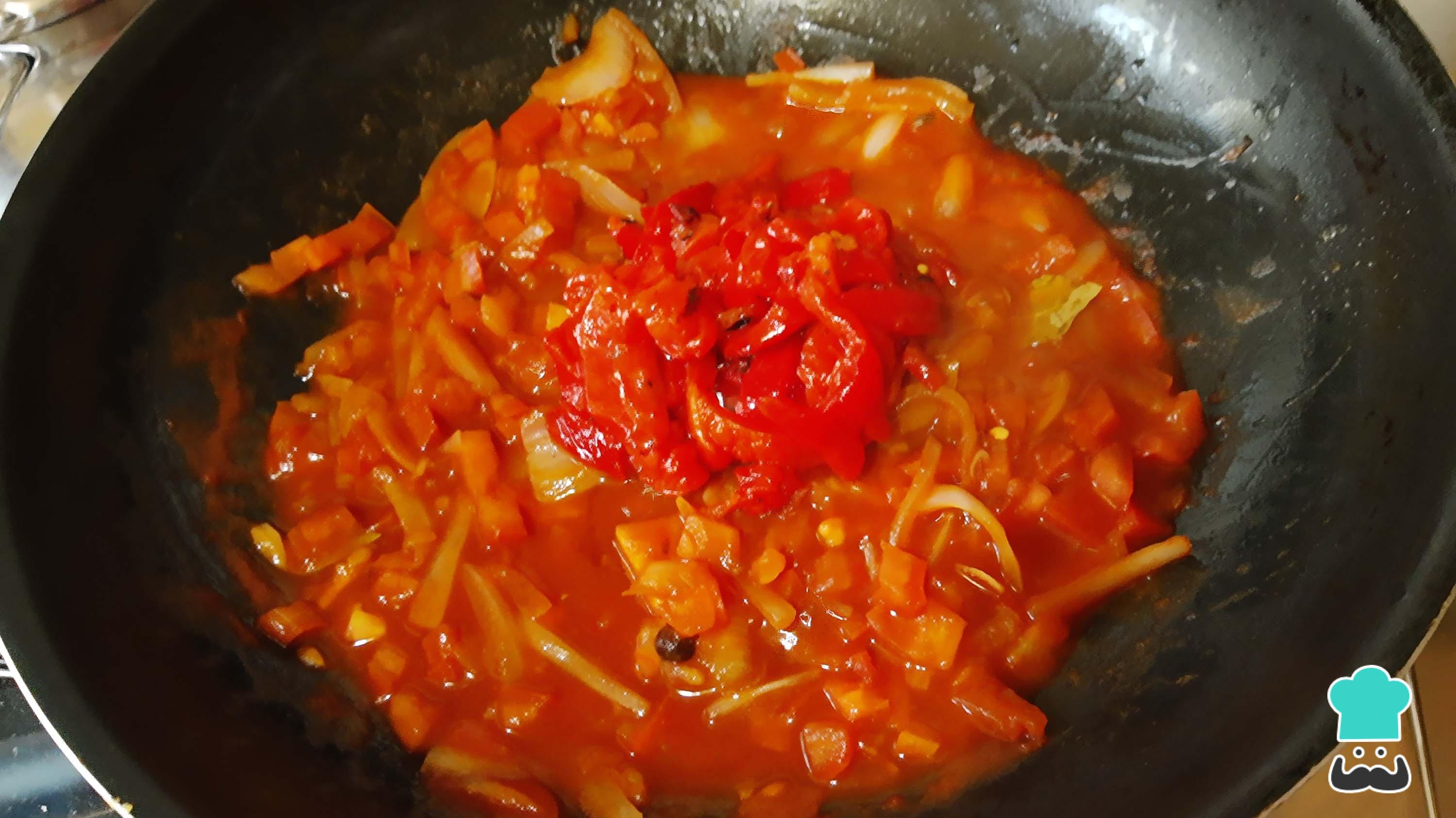 Incorpora el pimiento morrón, mezcla y deja cocinar por 5 minutos para comenzar a integrar los sabores tan característicos de la receta de pescado a la veracruzana.