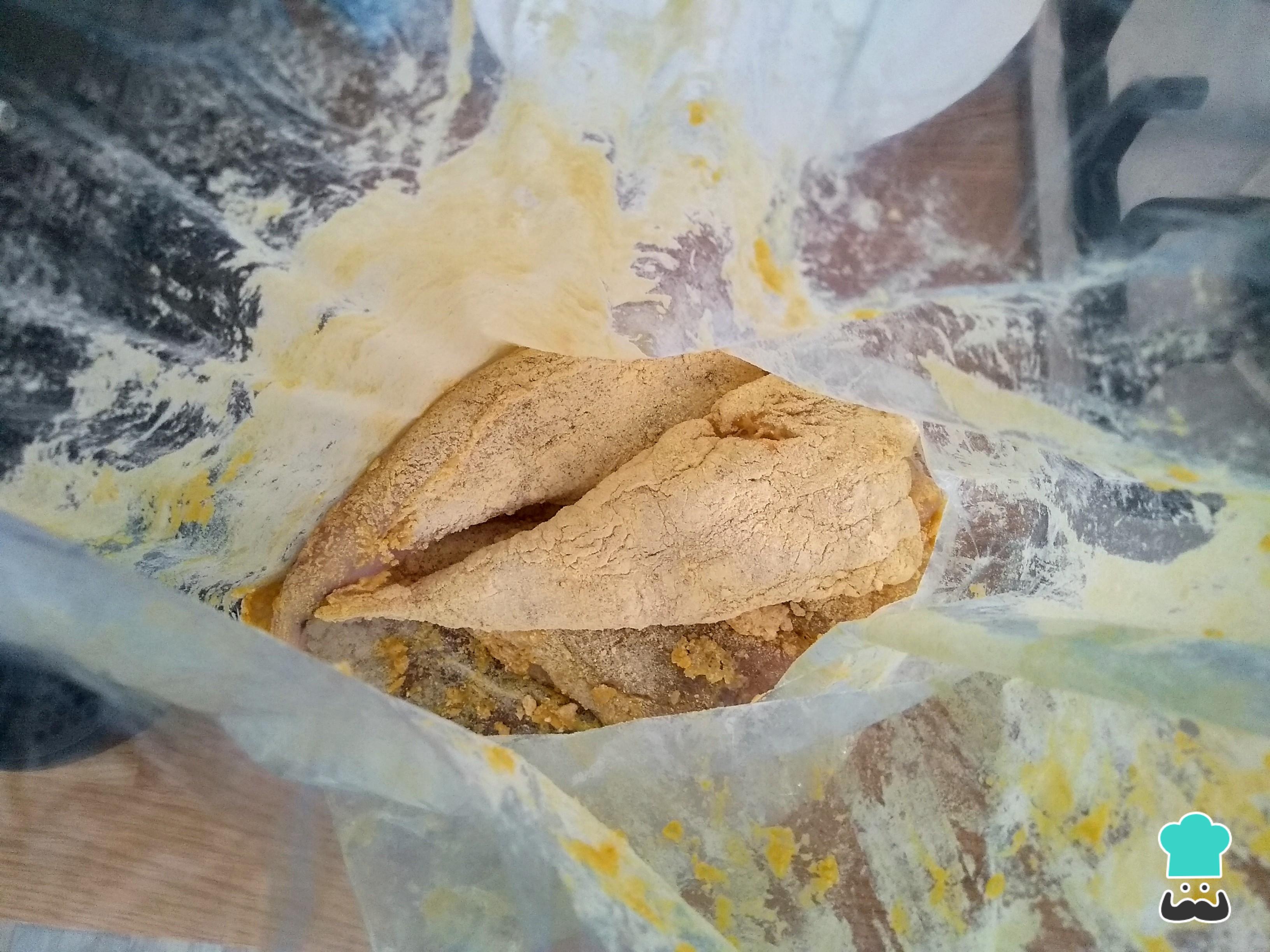 Por otro lado, pon harina en una bolsa e introduce el pescado añadiendo sal y pimienta. Cierra la bolsa y remueve con suavidad hasta que el rape esté bien cubierto de harina. Si, por el contrario, ves que no queda bien empapado de harina, añade más hasta que su aspecto se vea suelto y uniforme.