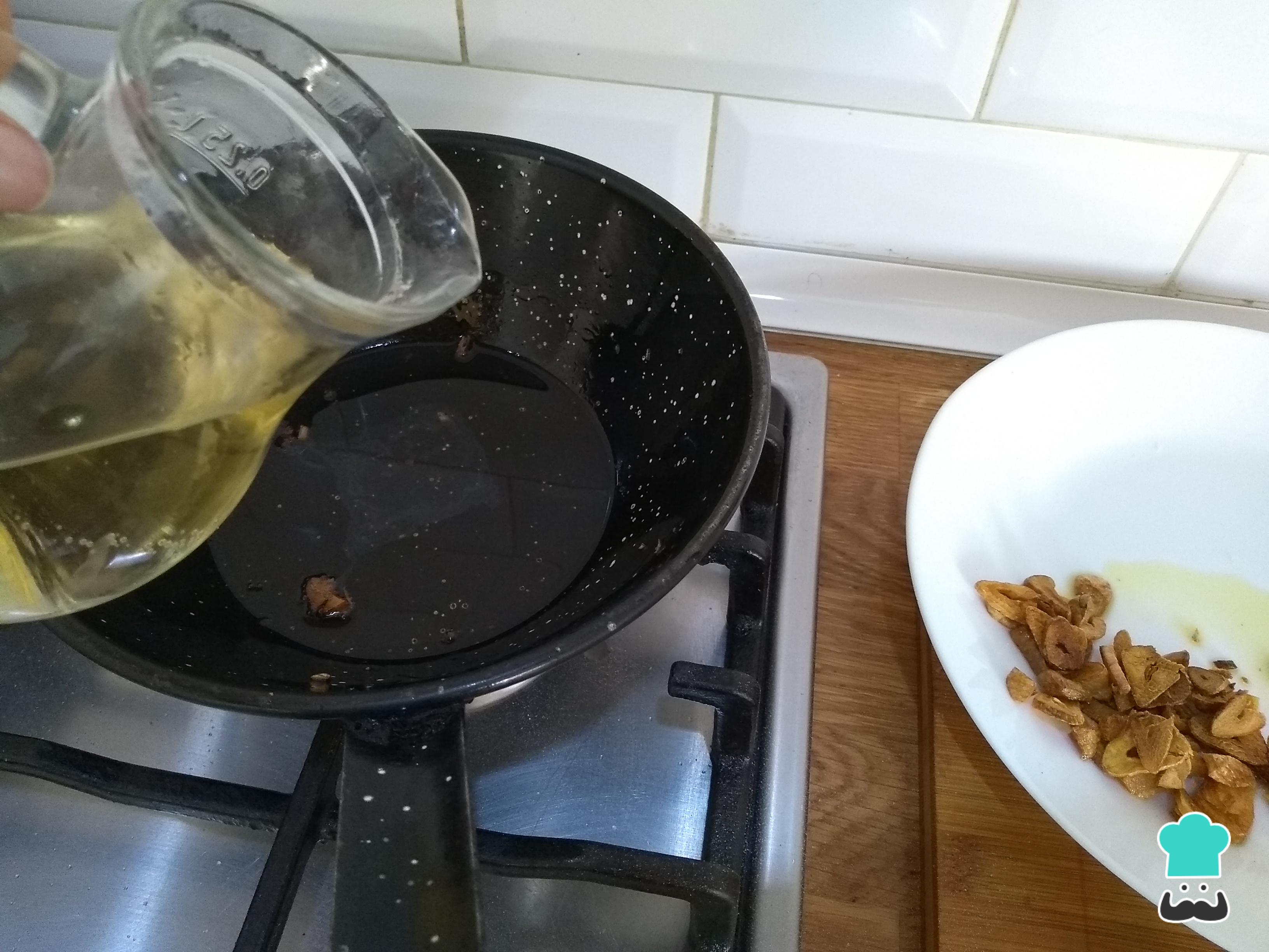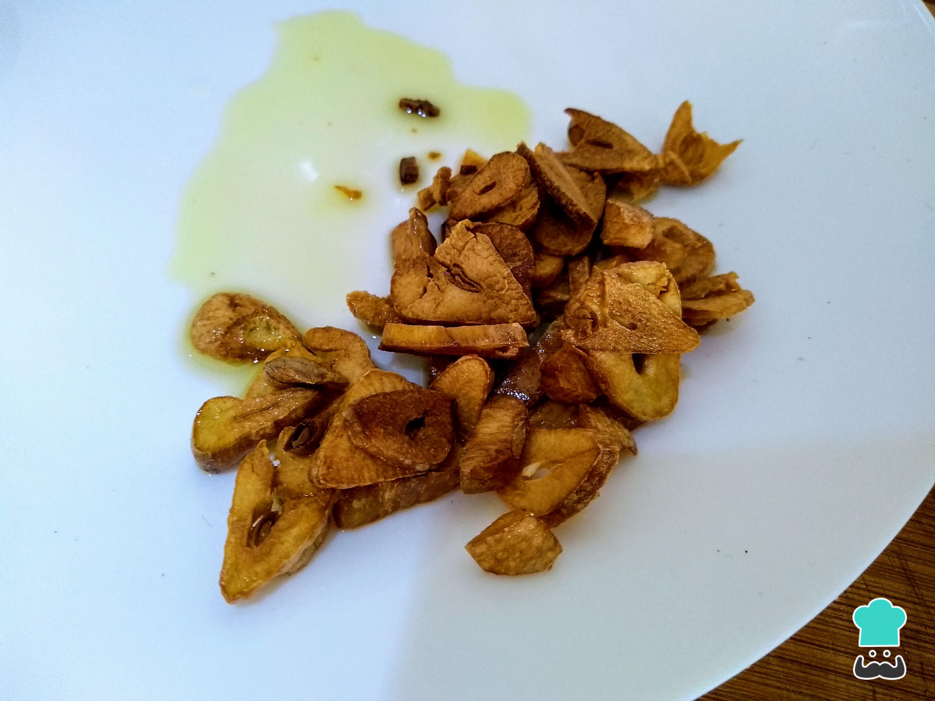 Pela y corta en láminas los dientes de ajo y fríelos con un buen chorro del mismo aceite que has usado para freír el rape. Remueve para que se tuesten por ambas partes sin que lleguen a quemarse, pero que su textura sea lo mas crujiente posible. Retira del fuego y saca las láminas de ajo frito.