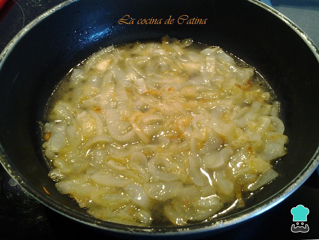 Por otro lado, pelamos y picamos la cebolla. Calentamos un par de cucharadas de aceite de oliva en una sartén y pochamos la cebolla a fuego lento con una pizca de sal.