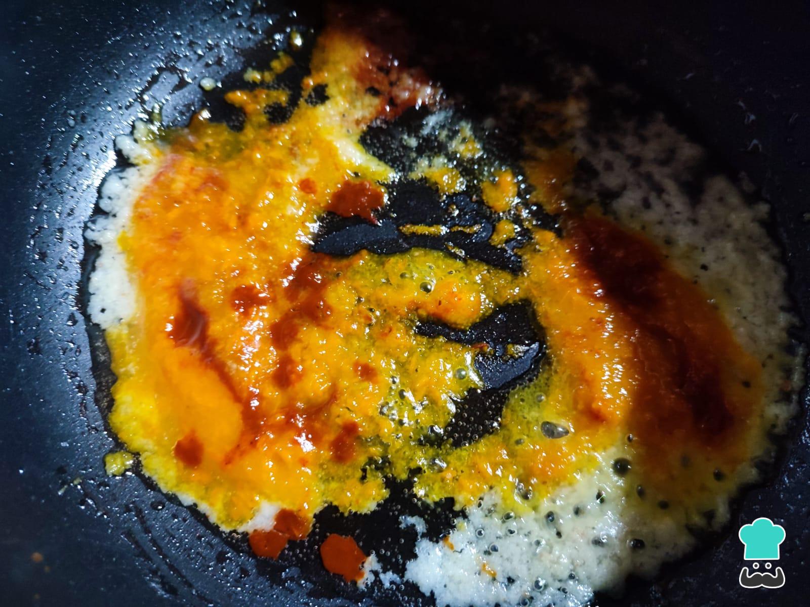 Ahora empieza con el aderezo. En una olla calienta a fuego medio un chorro de aceite vegetal y agrega el ajo molido, cocina por 1 minuto. Luego, añade la pasta de ají panca y también la pasta de ají amarillo, cocina por 2 minutos más.