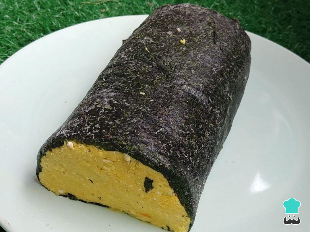 Corta el rollo de pescado vegano con alga nori en rodajas. En este punto de la preparación puedes congelar las rodajas para su uso posterior.