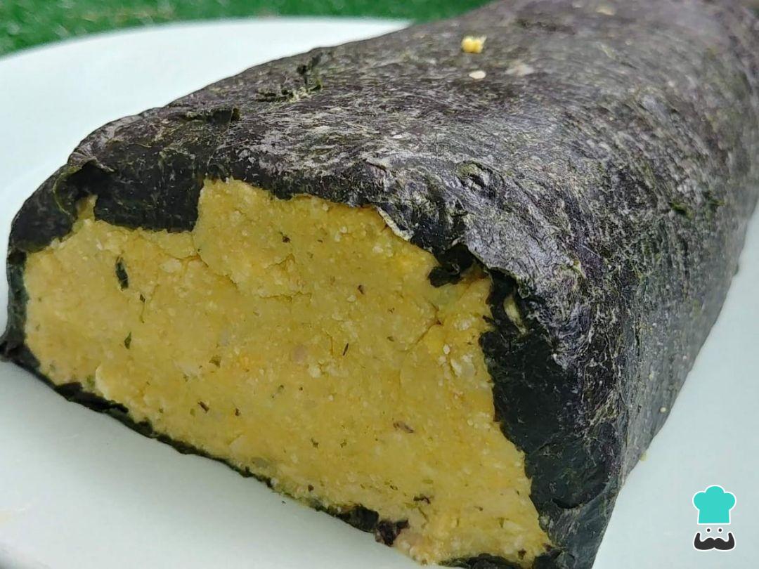 Amasa la batata hasta que todos los ingredientes queden bien integrados. Coloca la masa del pescado para veganos sobre el extremo inferior una hoja de alga nori y enrolla con cuidado dándole una forma ovalada. Moja el extremo opuesto del alga con un poco de agua para que se pegue bien. Pincela la segunda hoja del alga nori con agua con la ayuda de un pincel de cocina y envuelve el rollo de "pescado" vegano otra vez.