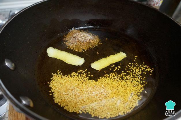 Para hacer la receta de los pestiños cordobeses, primero pon una sartén o un cazo con 150 ml. de aceite de oliva a calentar al fuego medio y añade unas tiras de cáscara de limón, la cuchara de anís en grano y el ajonjolí. Déjalo que se cocine unos minutos, apaga el fuego, deja se enfríe y se quede el aceite a temperatura ambiente.
