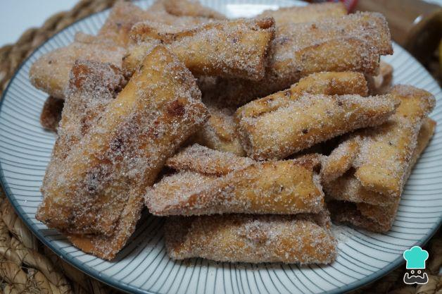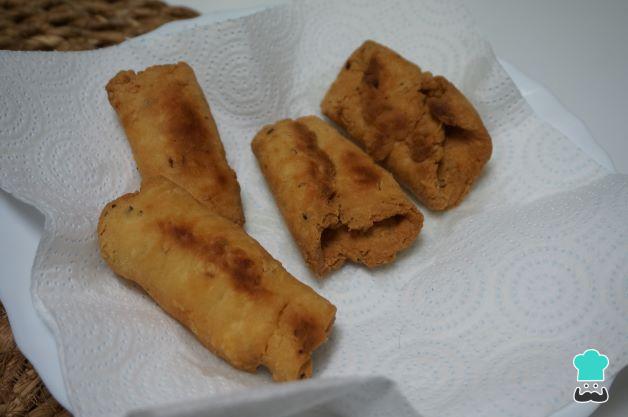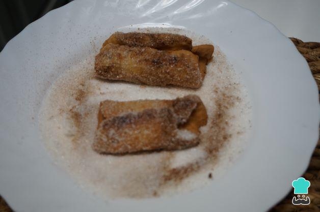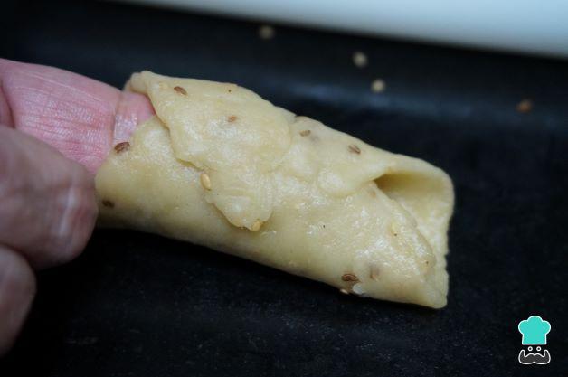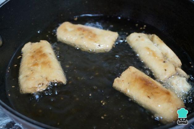 Proporciona forma al pestiño, un poco alargado y forma un rulo que coja tu dedo. Sella bien los bordes para que no se habrán al freírlos.