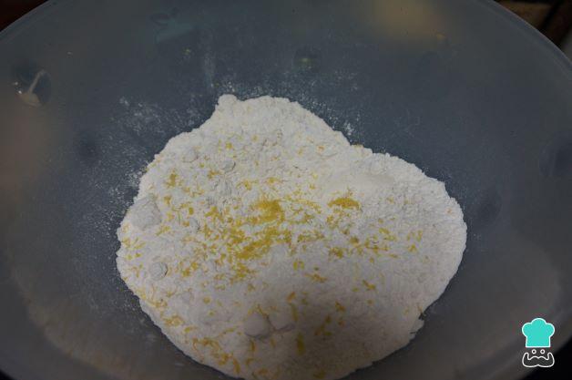 Coge un bol y añade la harina, la ralladura de un limón y una pizca de sal.