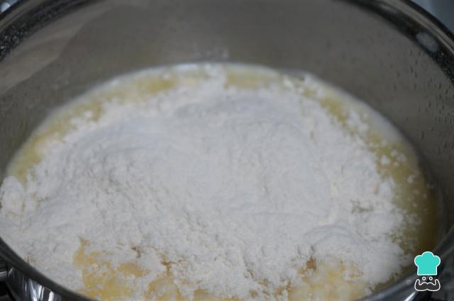 Ahora prepara la masa para los petisús. Para ello, lo primero que debes hacer es encender el horno a 200 ºC con calor arriba y abajo. Seguido, en un cazo coloca agua, leche, mantequilla, azúcar y una pizca de sal. Añade en el fuego hasta que se deshaga la mantequilla y se caliente todo. Cuando esté caliente, añade toda la harina de golpe.