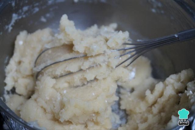 Empieza a remover con un batidor o cuchara y mezcla, señalamos que cuesta un poco. Remueve hasta que la masa se despegue de las paredes del cazo. Luego, apaga y deja que se enfríe un poco la masa.