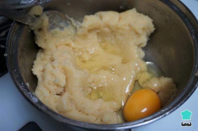Cuando esté templada la masa, añade los huevos uno a uno y mezcla todo muy bien. Primero echa uno y remueve, así veréis que cuesta mucho que se mezcle, pues con ayuda de una cuchara chafa la masa y mezcla, repite el proceso con los 4 huevos.