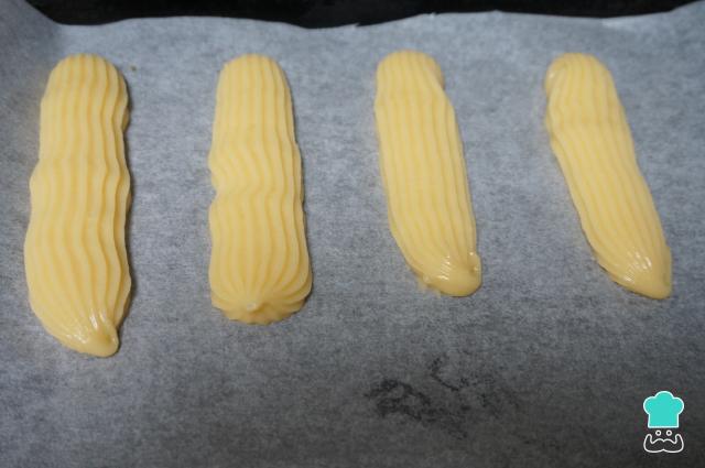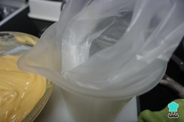 Coloca la masa en una manga pastelera desechable, y, si tenéis boquillas también podéis colocar una sin cortar el pico de la manga, debe ser como un dedo de gordo para hacer los petisús.