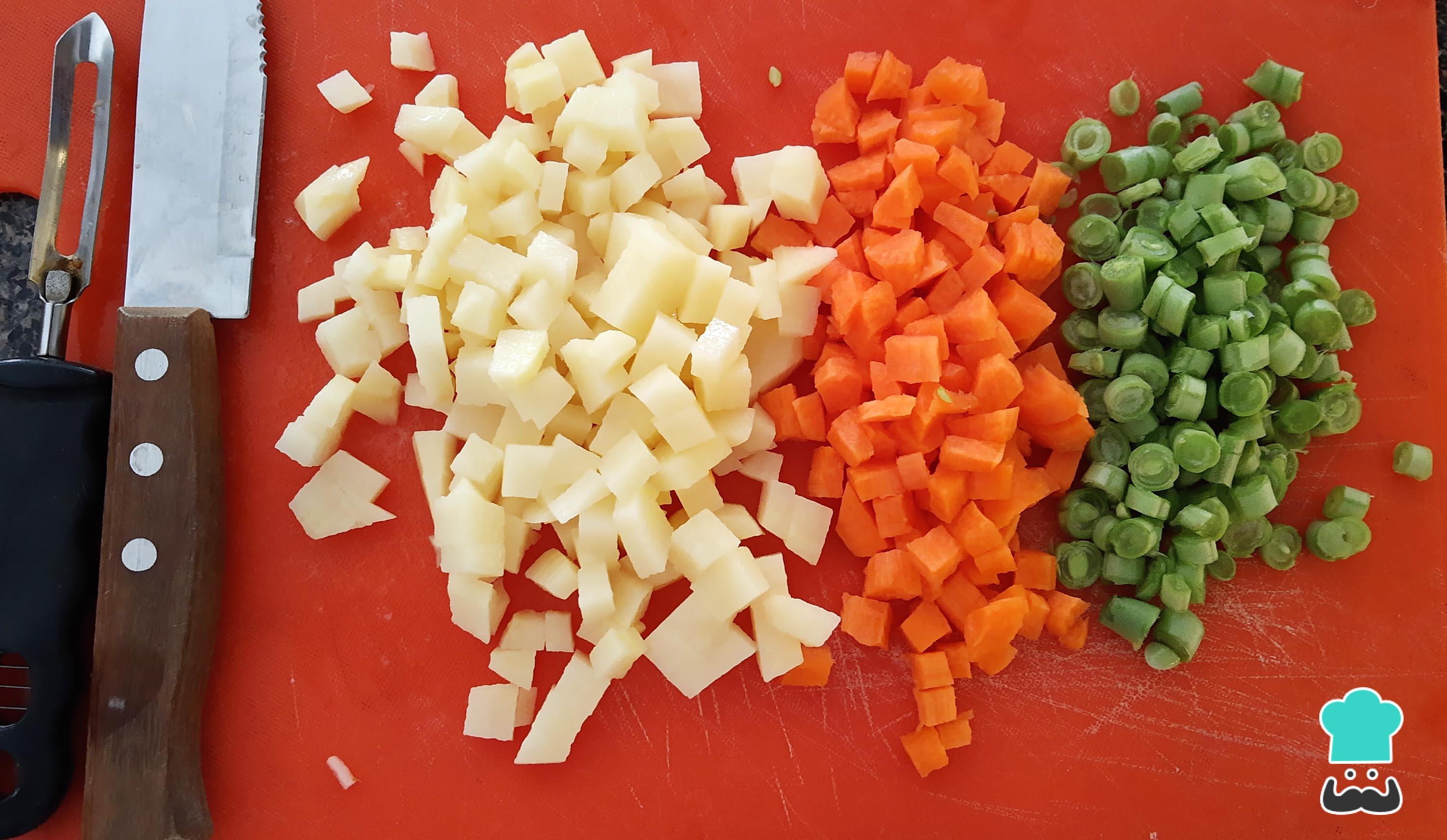 Para comenzar la receta de picadillo de pollo, limpia, pela y corta la zanahoria y la papa en cubos pequeños y trocea el ejote en rodajas también pequeñas.