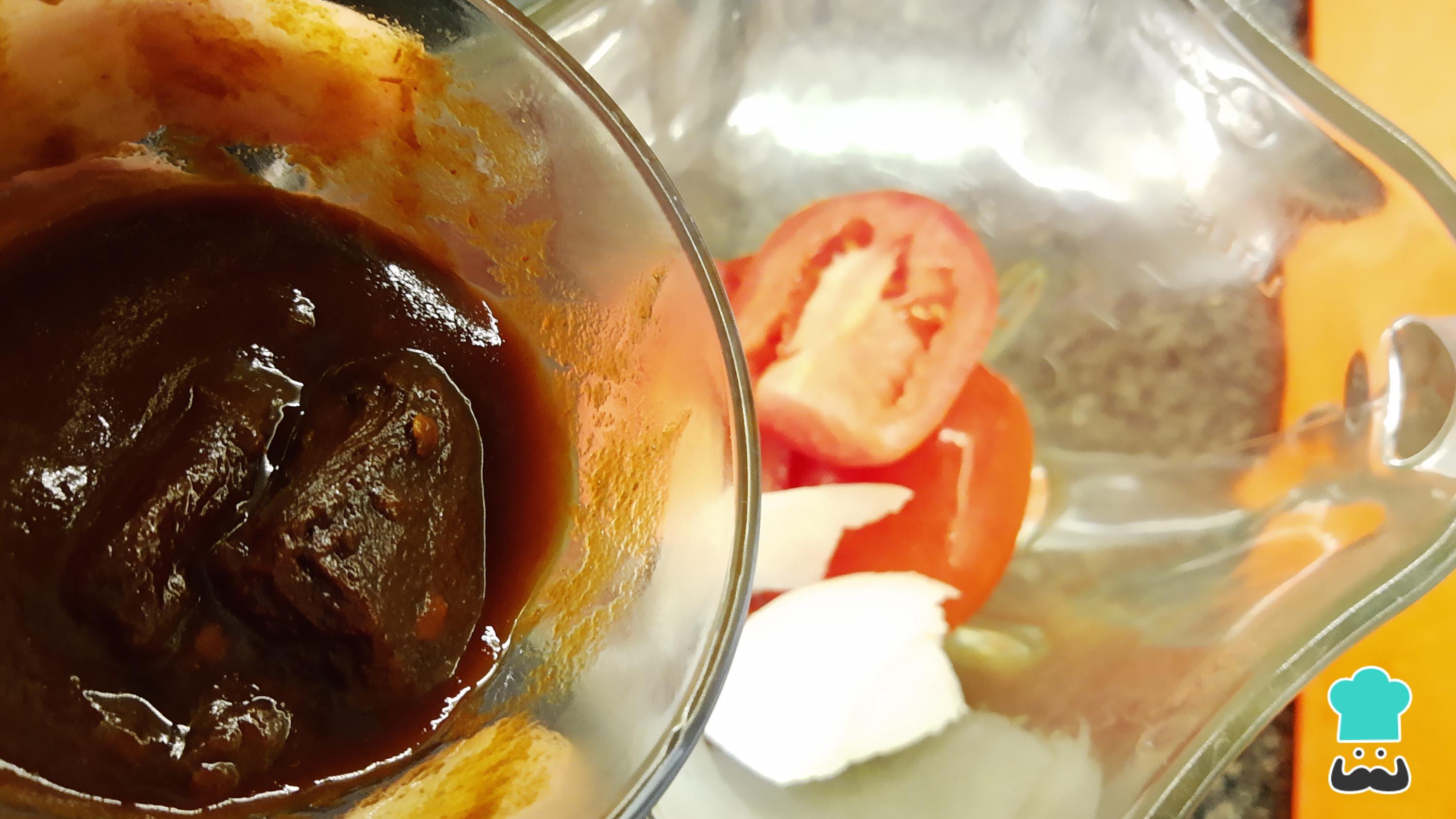 Mientras se cocina el pollo, licua los jitomates con el trozo de cebolla, una taza de agua y el chile chipotle al gusto. Tritura durante al menos 3 minutos a velocidad media.