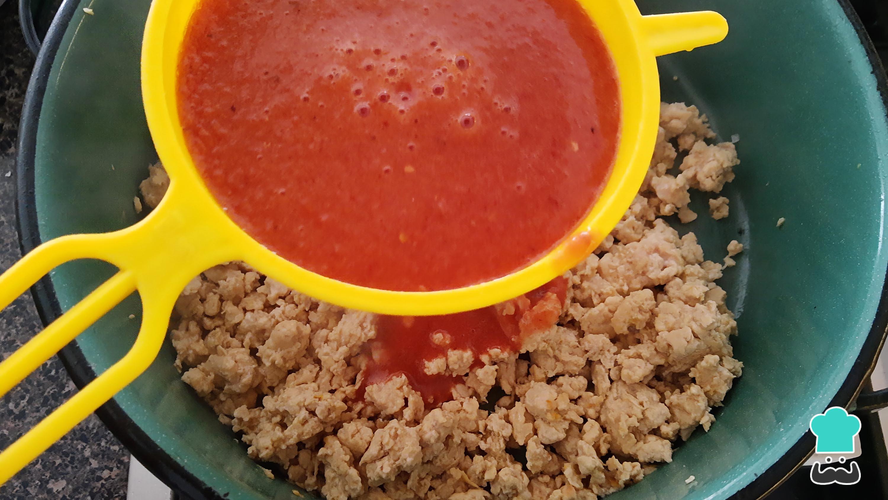 Calienta en una olla o sartén grande 1 cucharada de aceite y cocina la pechuga de pollo molida. Sazona con sal al gusto y mueve constantemente hasta que esté bien cocida la carne y comience a dorarse.