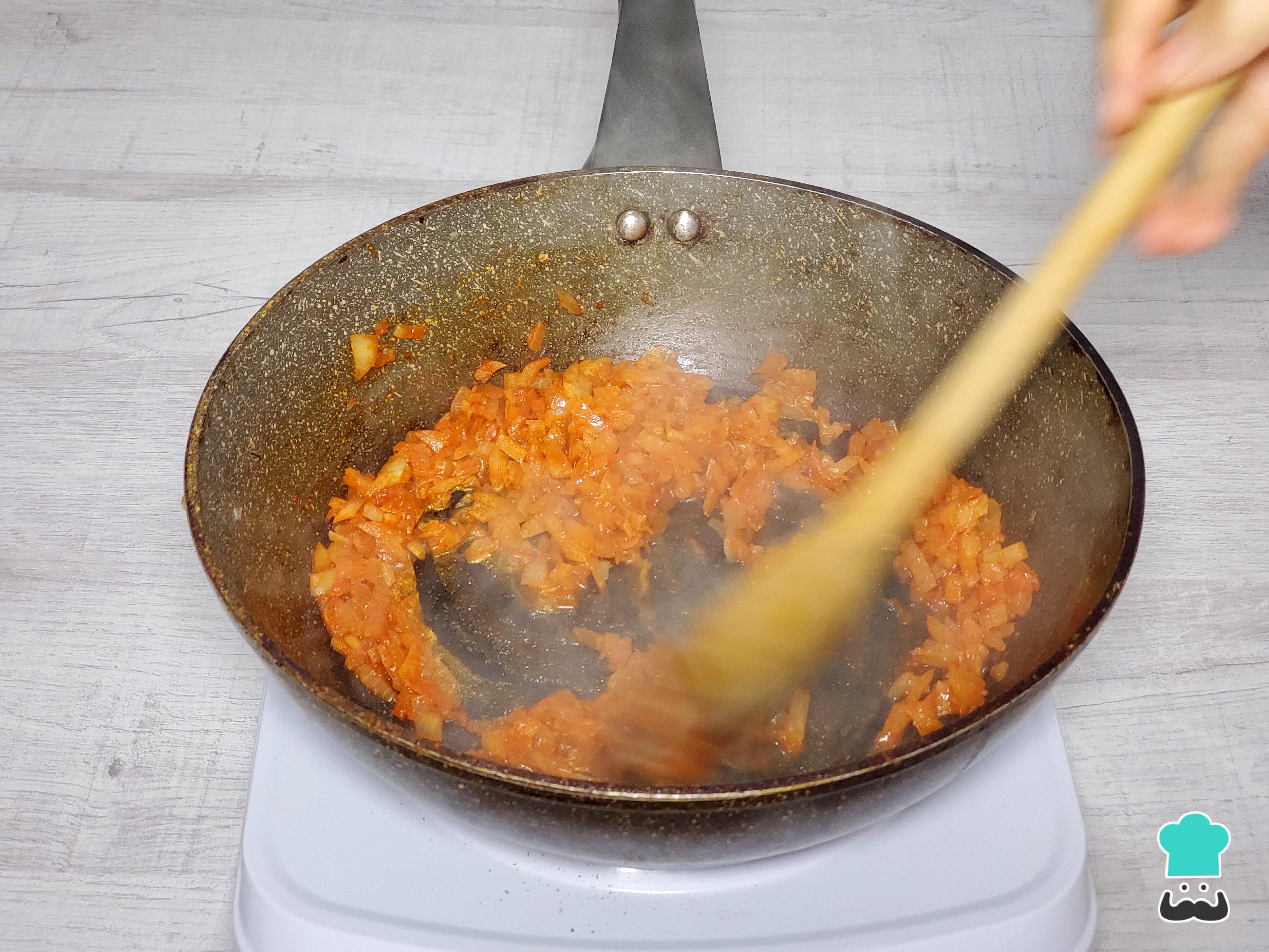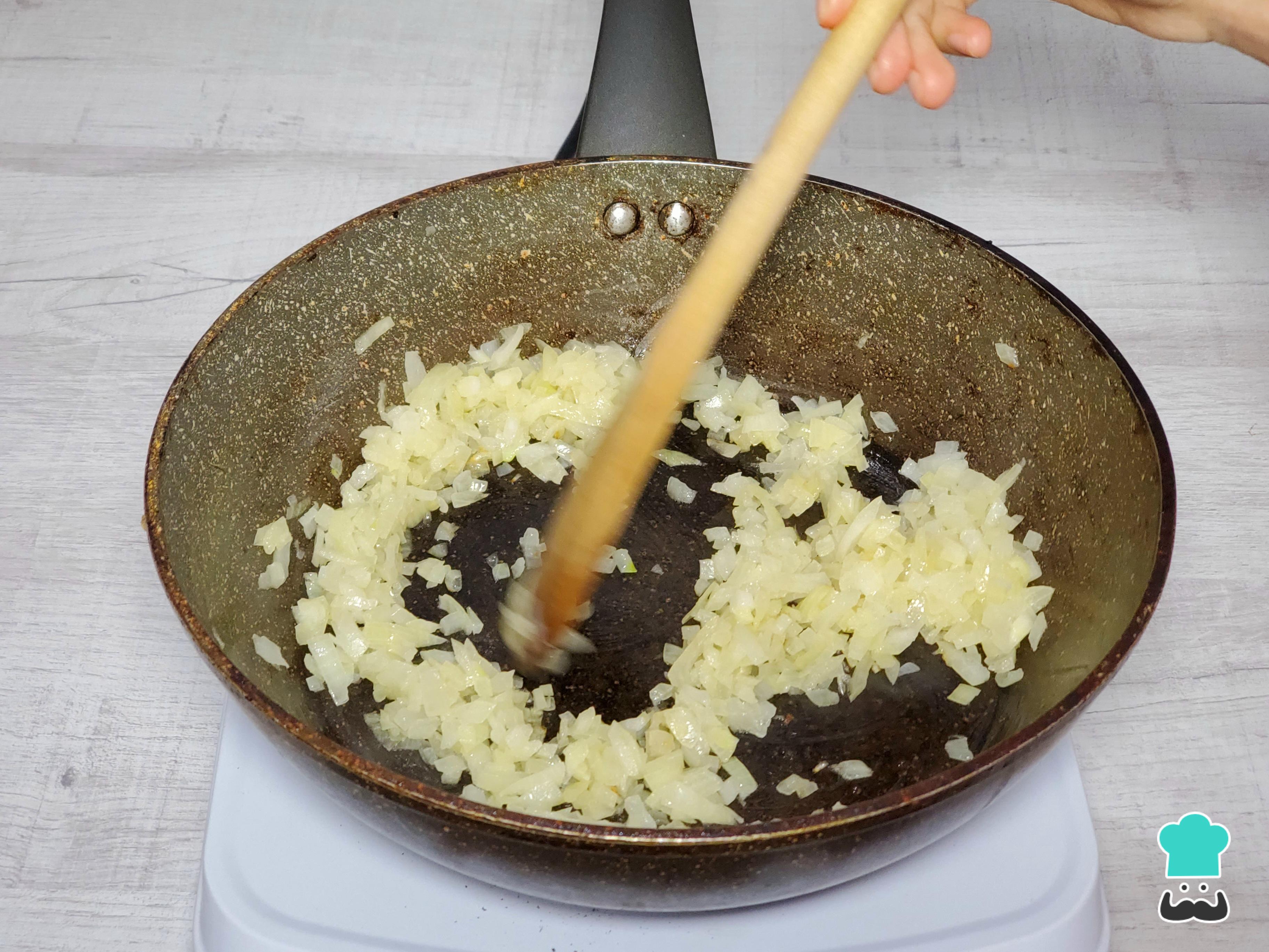 Empieza colocando en una sartén profunda o en una olla un buen chorro de aceite de oliva. Cuando esté caliente, añade la cebolla finamente picada y remueve por unos minutos para formar el aderezo.