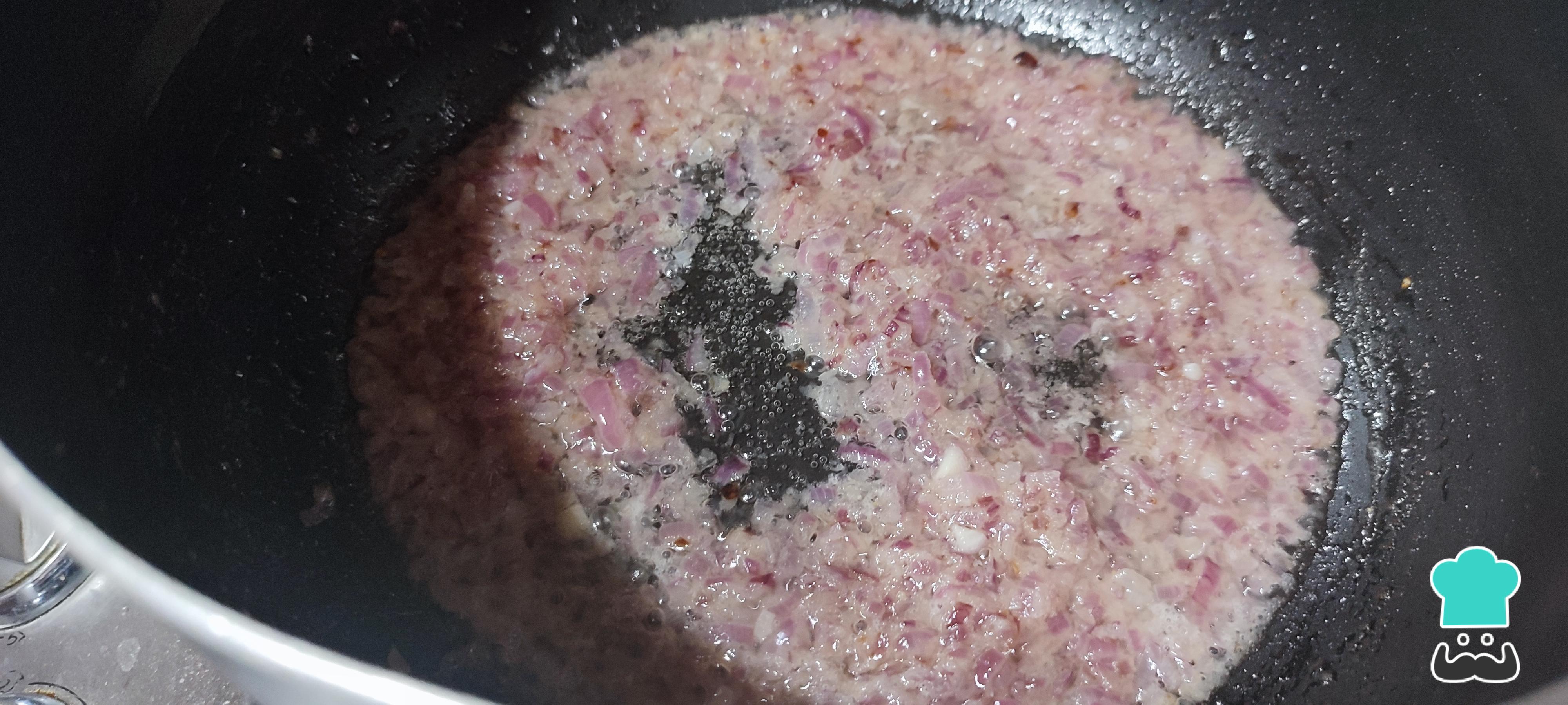 La clave de este plato está en hacer un buen aderezo. Por ello, calienta en una olla el chorro de aceite y sofríe la cebolla roja previamente picada en cuadraditos por 2 minutos. Luego, agrega el ajo molido y sofríe por 2 minutos más.