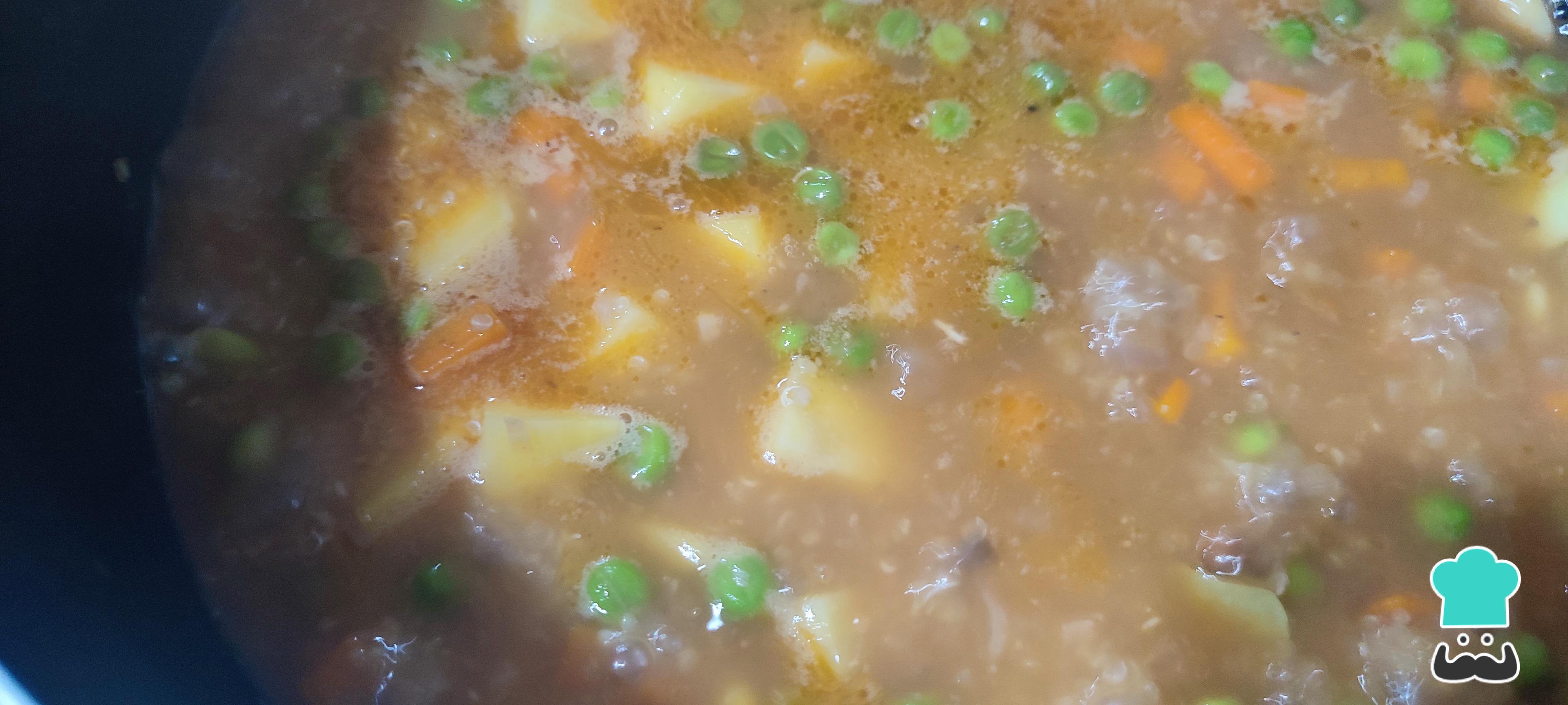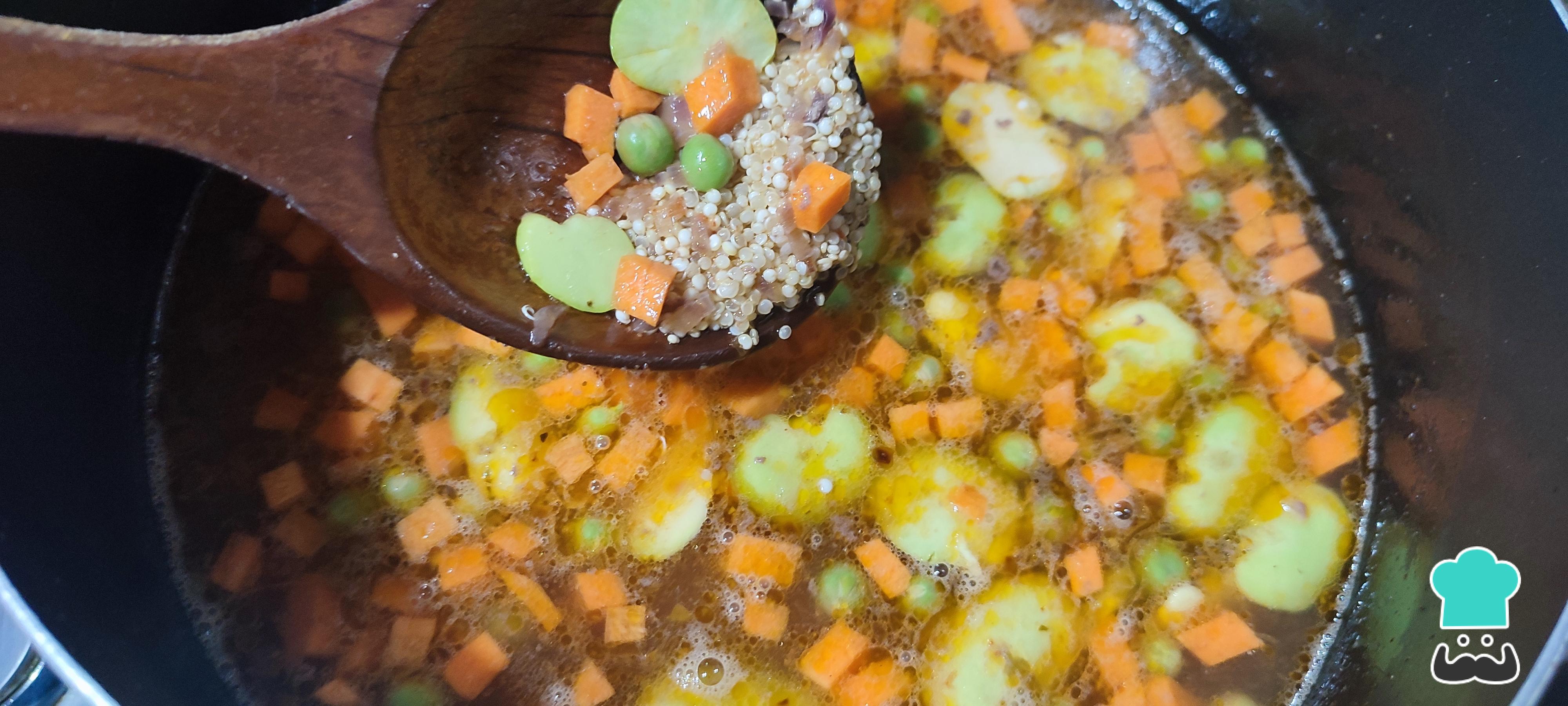 Agrega la quinua previamente lavada y echa también agua (o en el mejor de los casos, agrega caldo de pollo o de carne). Además, añade también la zanahoria picada en cuadritos, las habas peladas y las alverjitas. A continuación, agrega una pizca de sal, pimienta y comino, deja cocinar aproximadamente 15 minutos.
