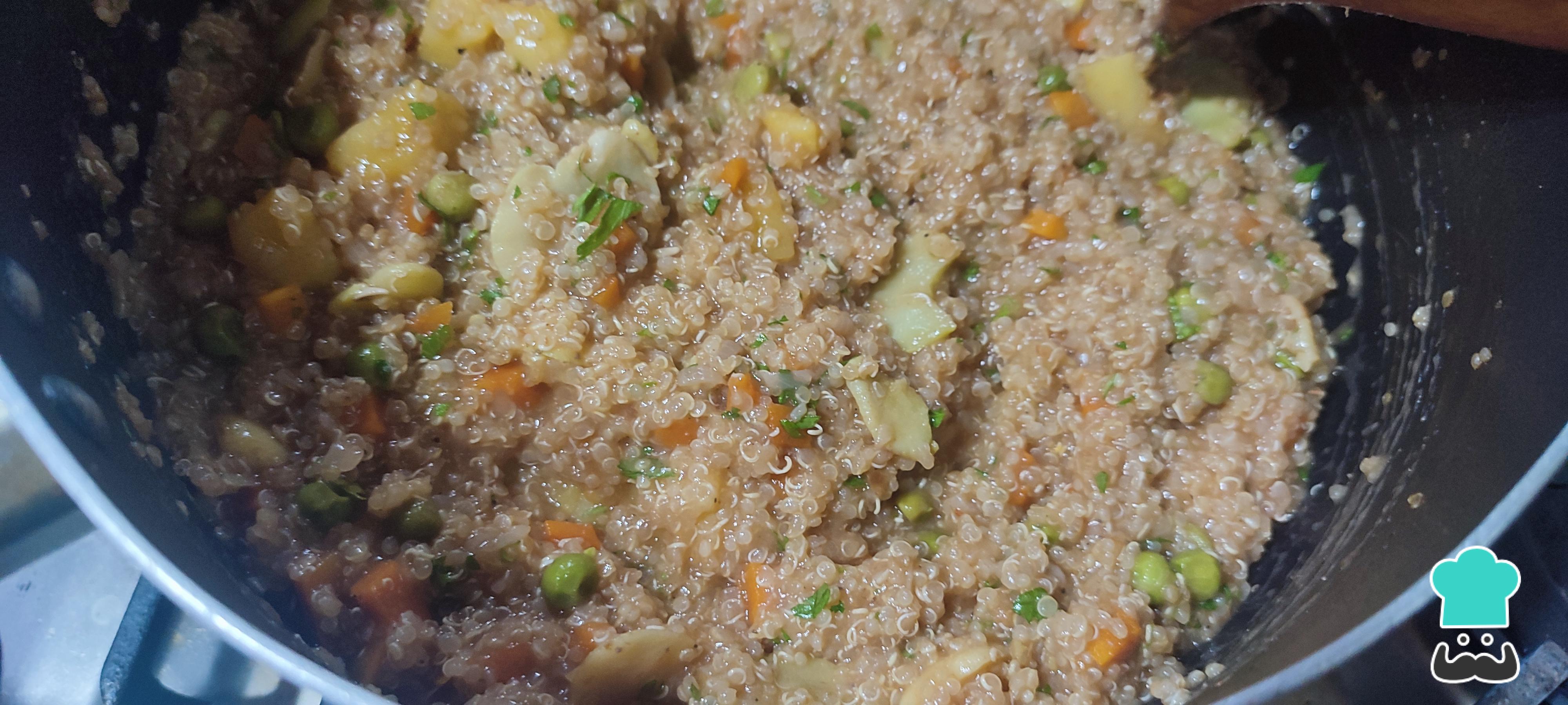 Truco: la cantidad de agua o de caldo deberá ser la necesaria para cubrir la quinua. Y, si ves que se seca la preparación, puedes agregar más líquido poco a poco.