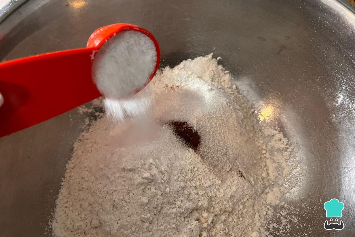 En un bol, agrega la harina de trigo sin polvos de hornear, el azúcar, la canela y la pizca de sal.