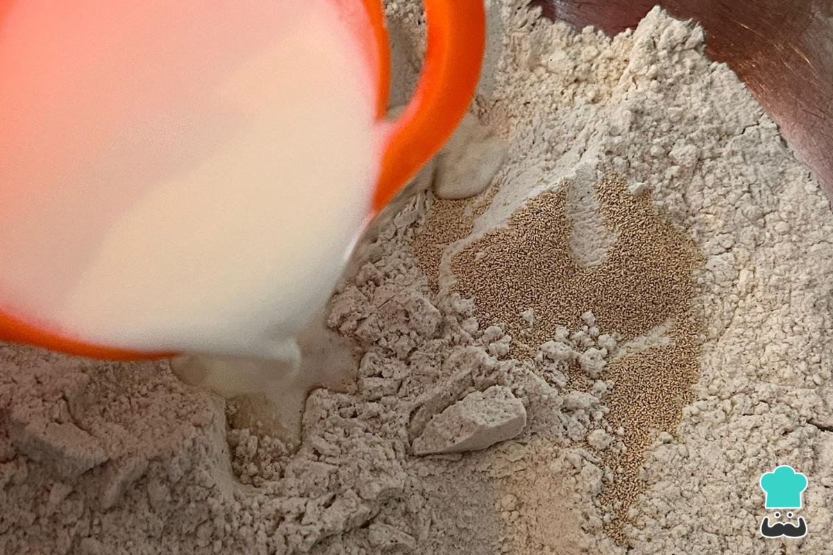 Añade la levadura instantánea a los ingredientes secos e incorpora también la leche tibia.