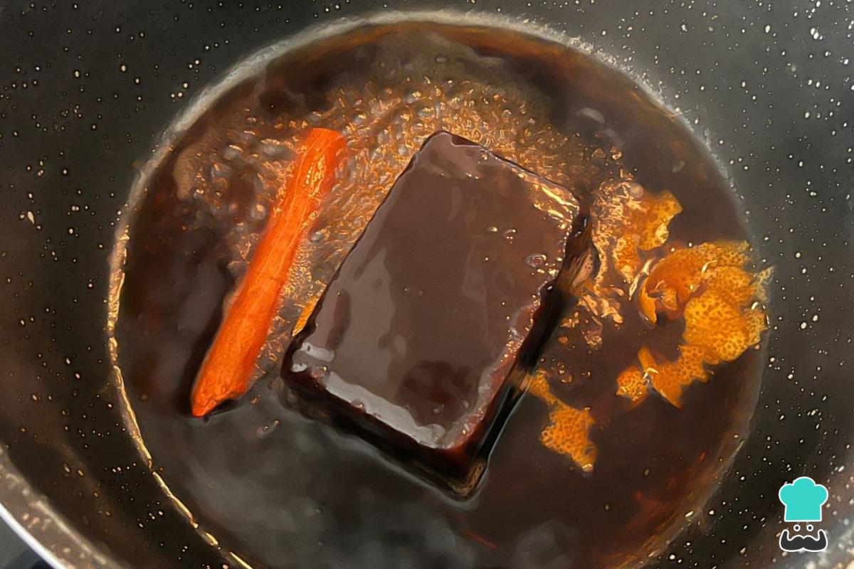 Mientras la masa duplica su tamaño, prepara la salsa. Para ello, calienta en una olla a fuego medio el agua, la chancaca, la piel de naranja y el clavo de olor.
