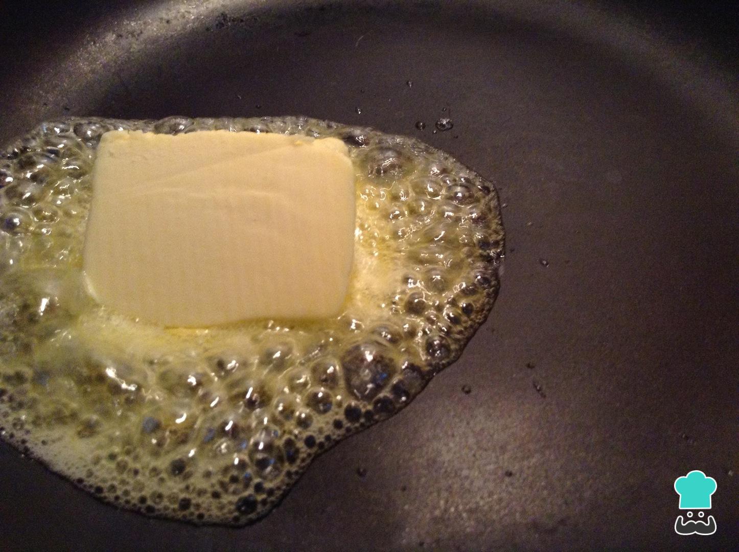 Cuando la mantequilla esté derretida casi por completo, incorpora el pan y remueve para que se bañen con esta lo más posible.