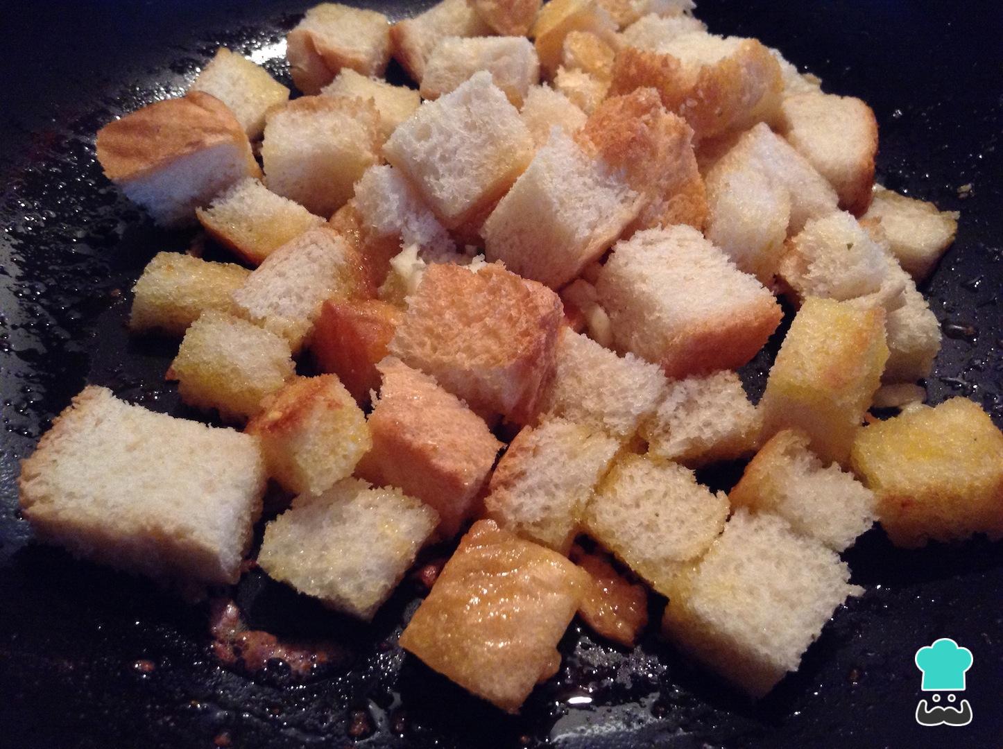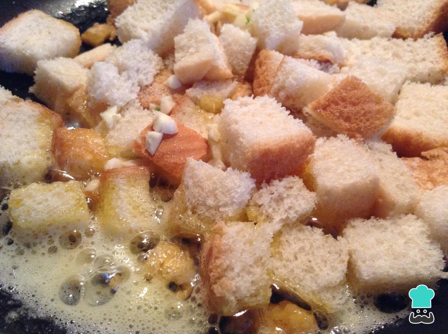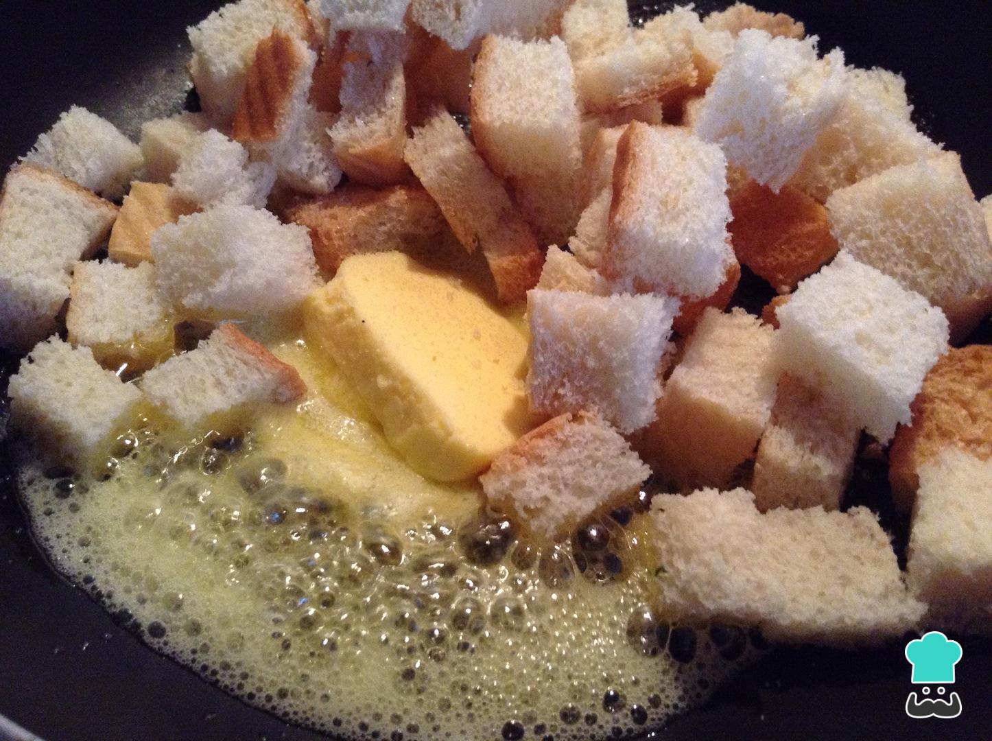 Una vez los croûtons absorban toda la mantequilla, baja a fuego lento y deja dorar.