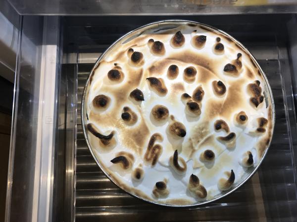 Con la ayuda de una cuchara y una manga repostera decora el pie de limón peruano con galletas. Con la cuchara (de madera o una espátula de silicona) cubre la superficie de la tarta. Luego, utilizando la manga de repostería (o incluso la misma cuchara o un tenedor) crea picos con el merengue, o dale la forma que más te guste. Regresa al horno hasta que se dore ligeramente la cubierta.