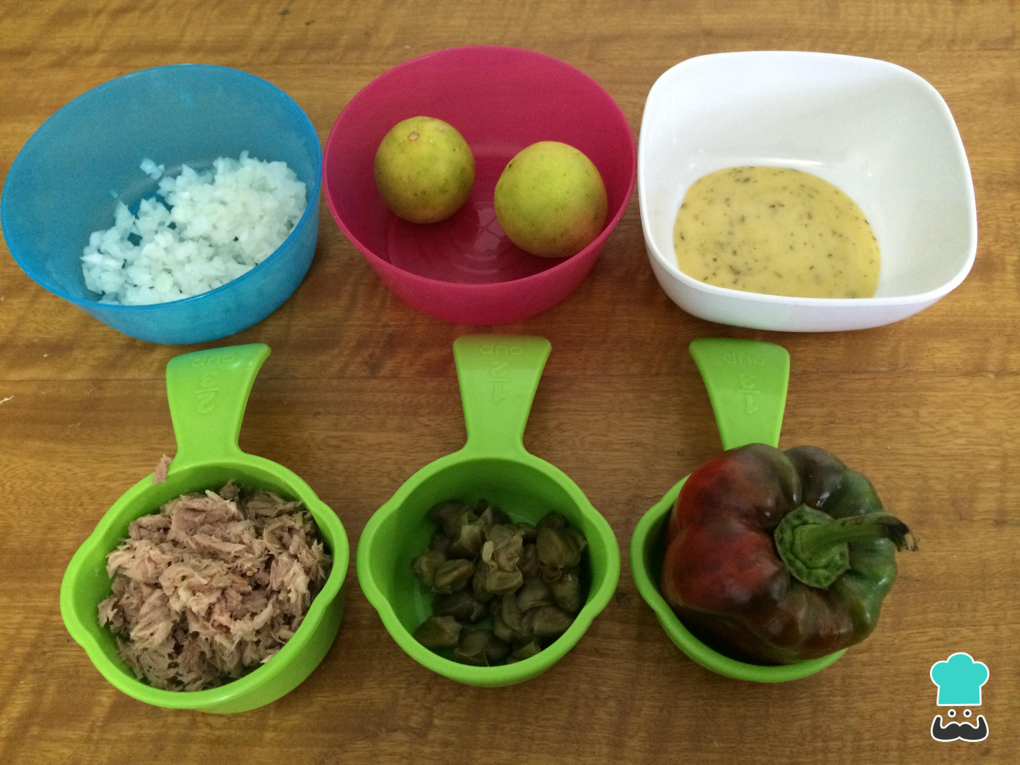En un bol, mezclar la cebolla y las alcaparras picadas finamente, el zumo del limón, sal y pimienta.