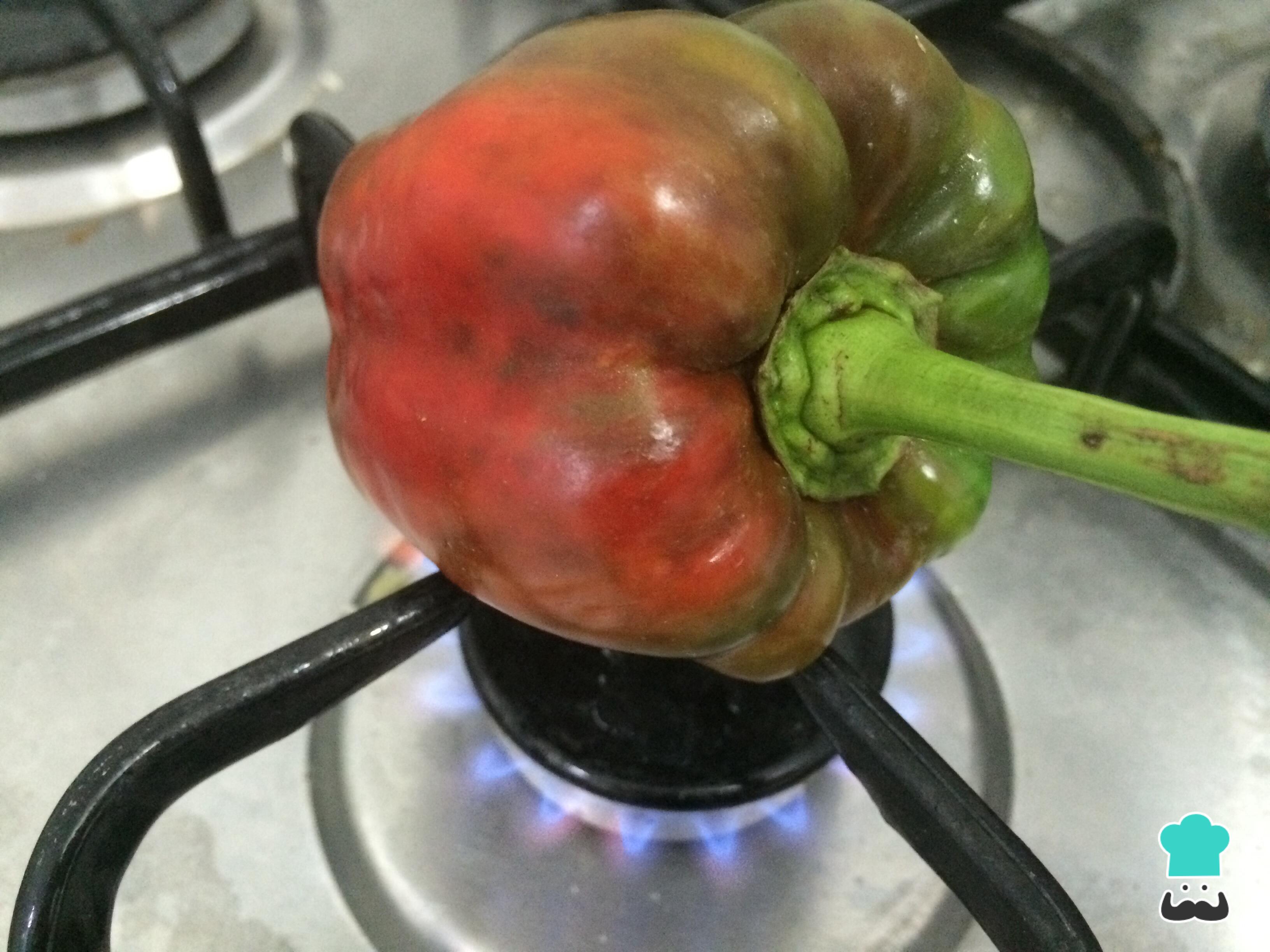 Llevar al fuego el pimiento, hasta que la piel esté completamente negra. Retirar la piel quemada cuando esté frío el pimiento y sacar las semillas de adentro, abriéndolo por la parte del tallo, reservar.