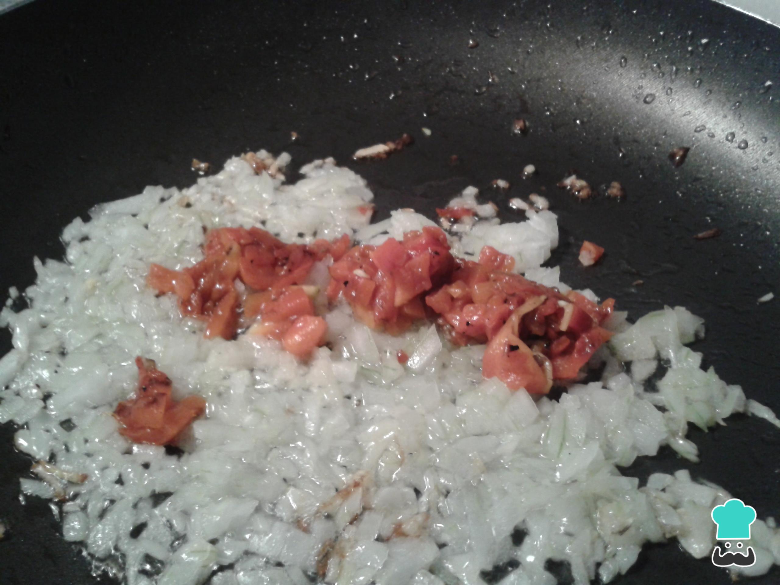 Para empezar con el sofrito base, cortamos la cebolla en cubos pequeños, el ajo finamente junto con el pimiento de piquillo asado. Ponemos a sofreír con 3 cucharas de aceite en una sartén amplia.