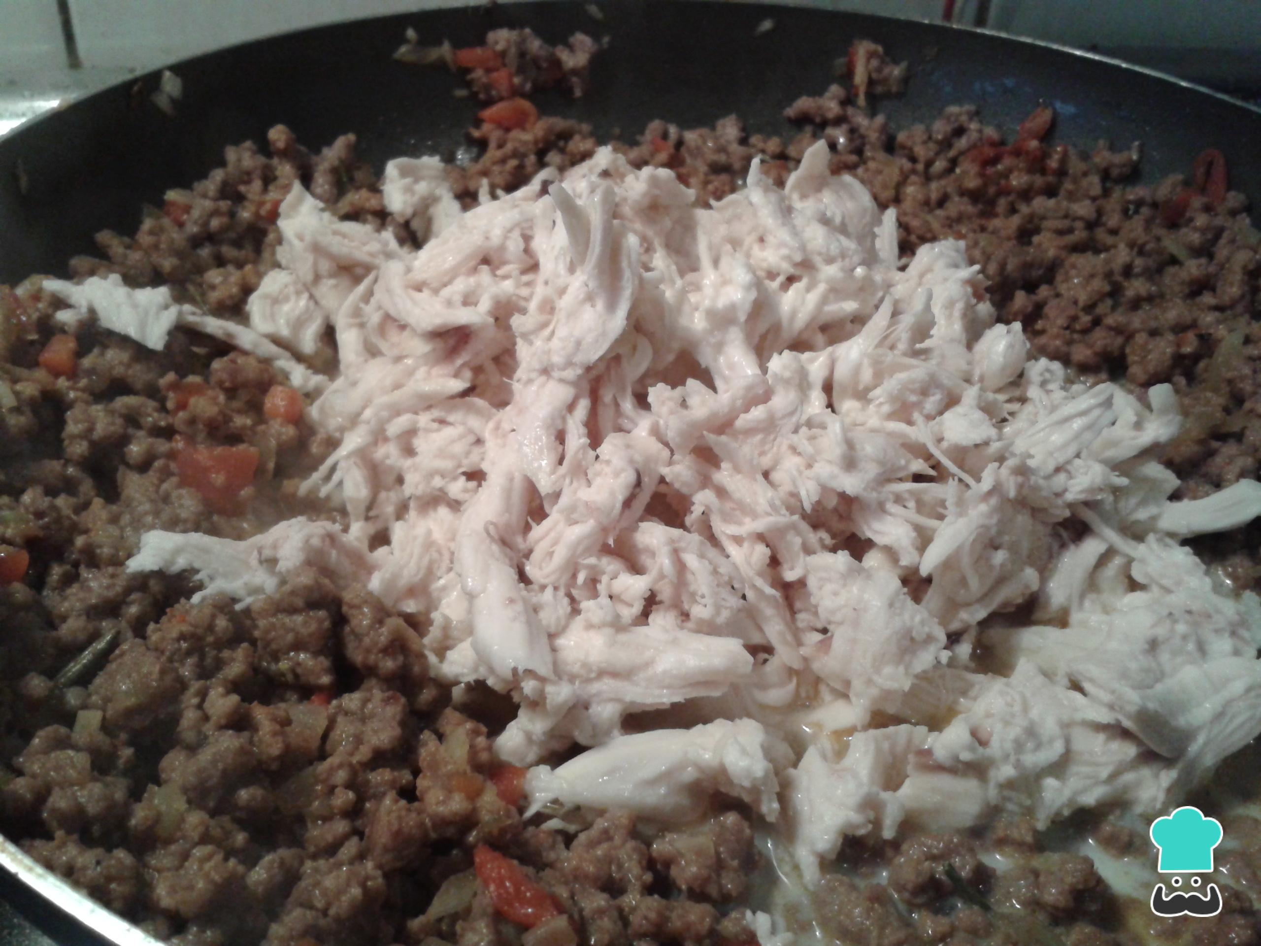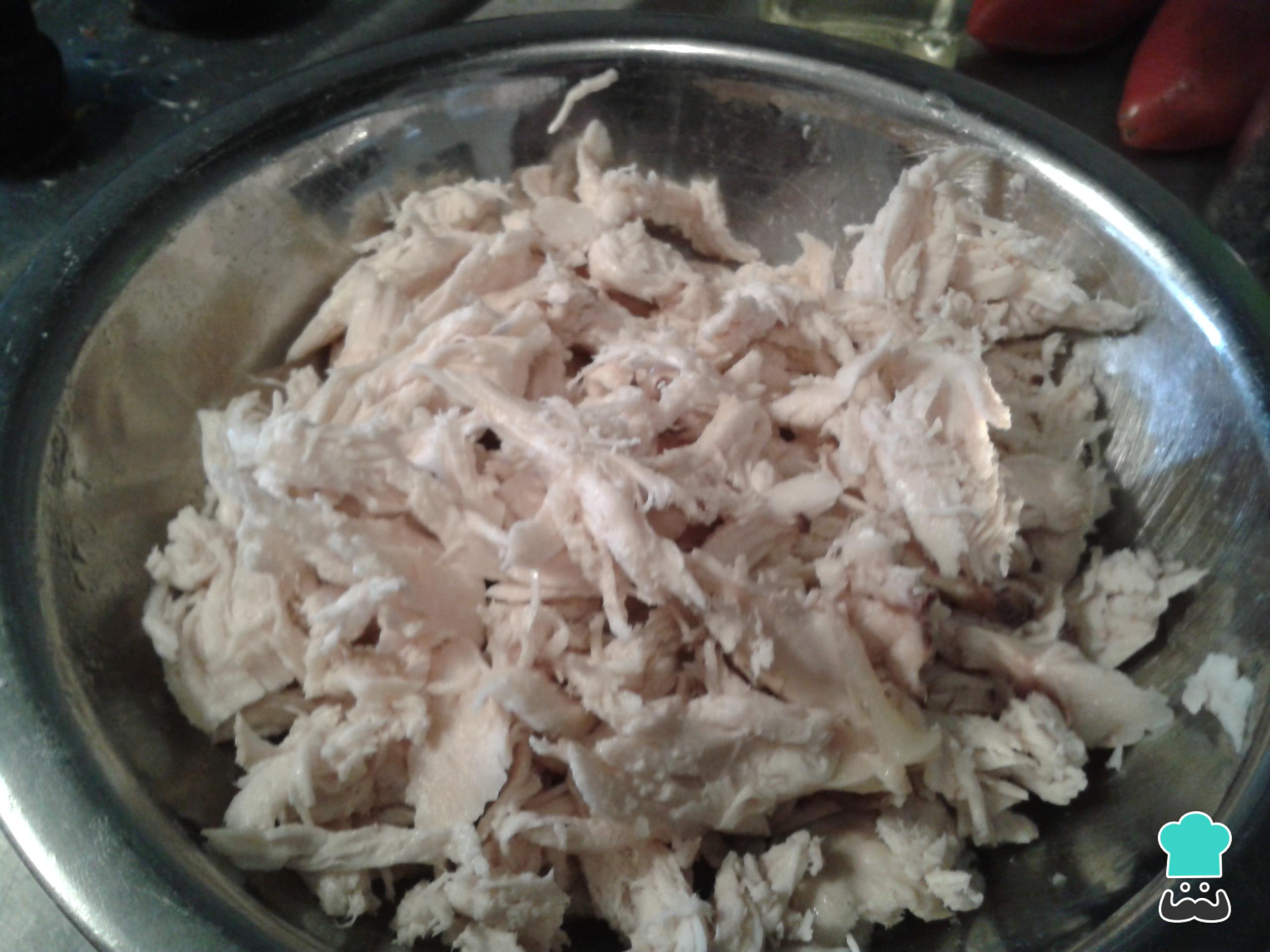 Mientras, tomamos la pechuga de pollo y desmechamos la carne para obtener pollo deshilachado. Para ver este procedimiento paso a paso puedes echar un vistazo a la receta de sándwich de pollo y aguacate donde también se utiliza pollo cocido y desmechado.