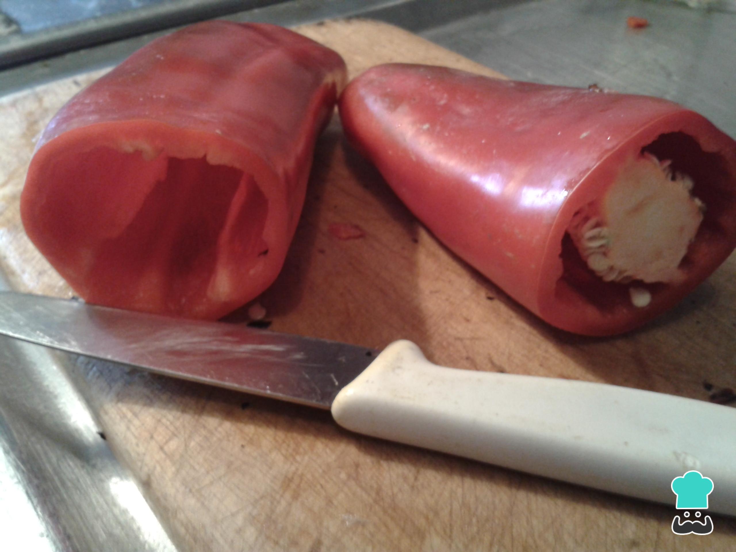 Por otro lado, abrimos los pimientos crudos y con cuidado le retiramos los pedúnculos, las semillas y parte de las venas.