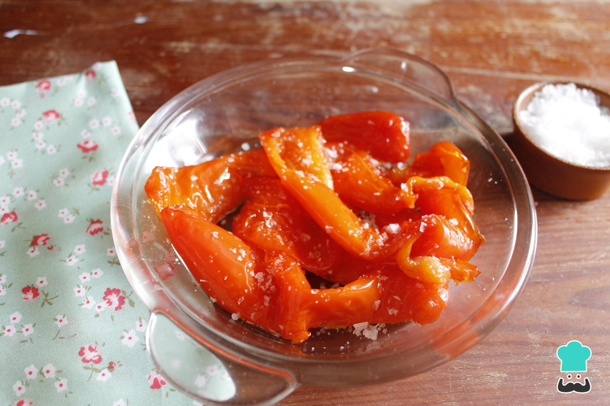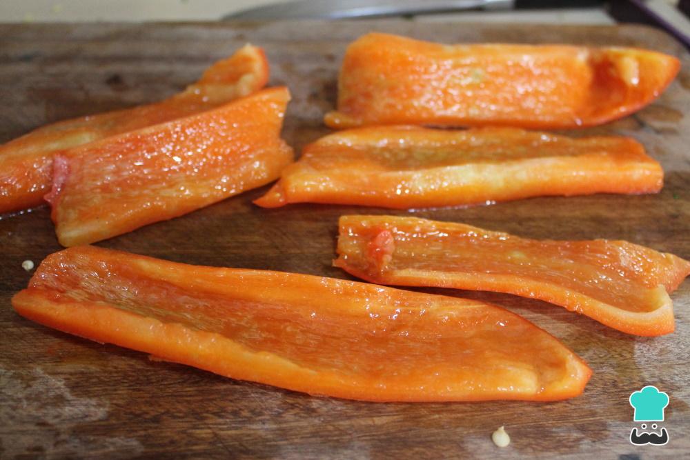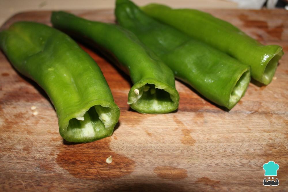 Si, por el contrario, utilizas unos pimientos grandes, como los rojos, lávalos y sécalos igualmente. Trocéalos en tiras grandes y retira todas las semillas, quita las partes más blanquecinas de la zona interna de los pimientos.