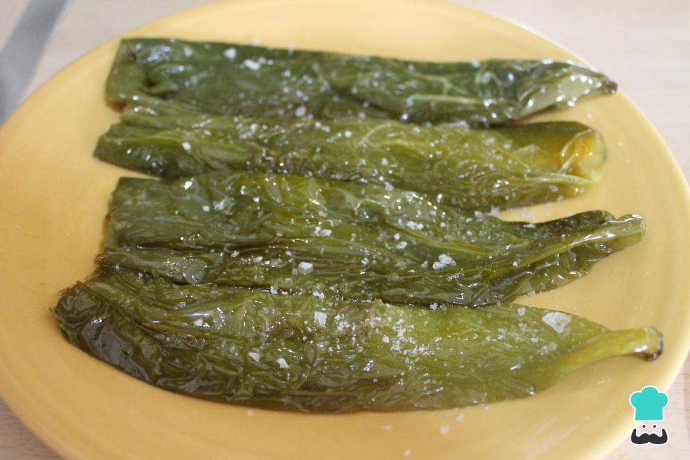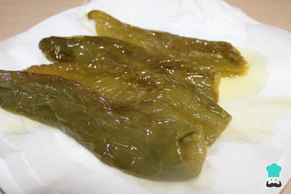 Coloca los pimientos en una fuente con papel absorbente de cocina para retirar un poco el exceso de aceite, sobre todo si son los enteros, pues habrá entrado más aceite en el interior.